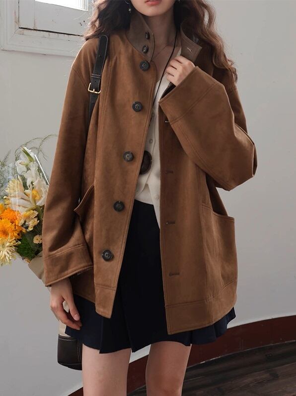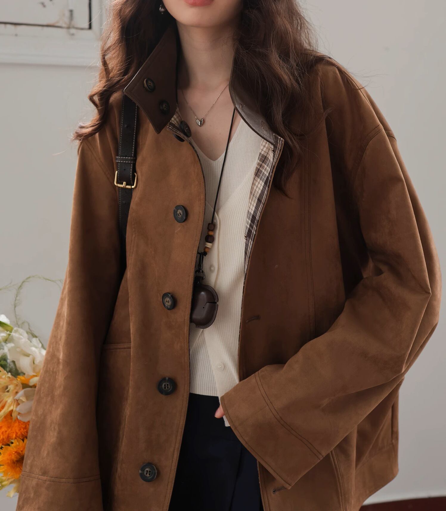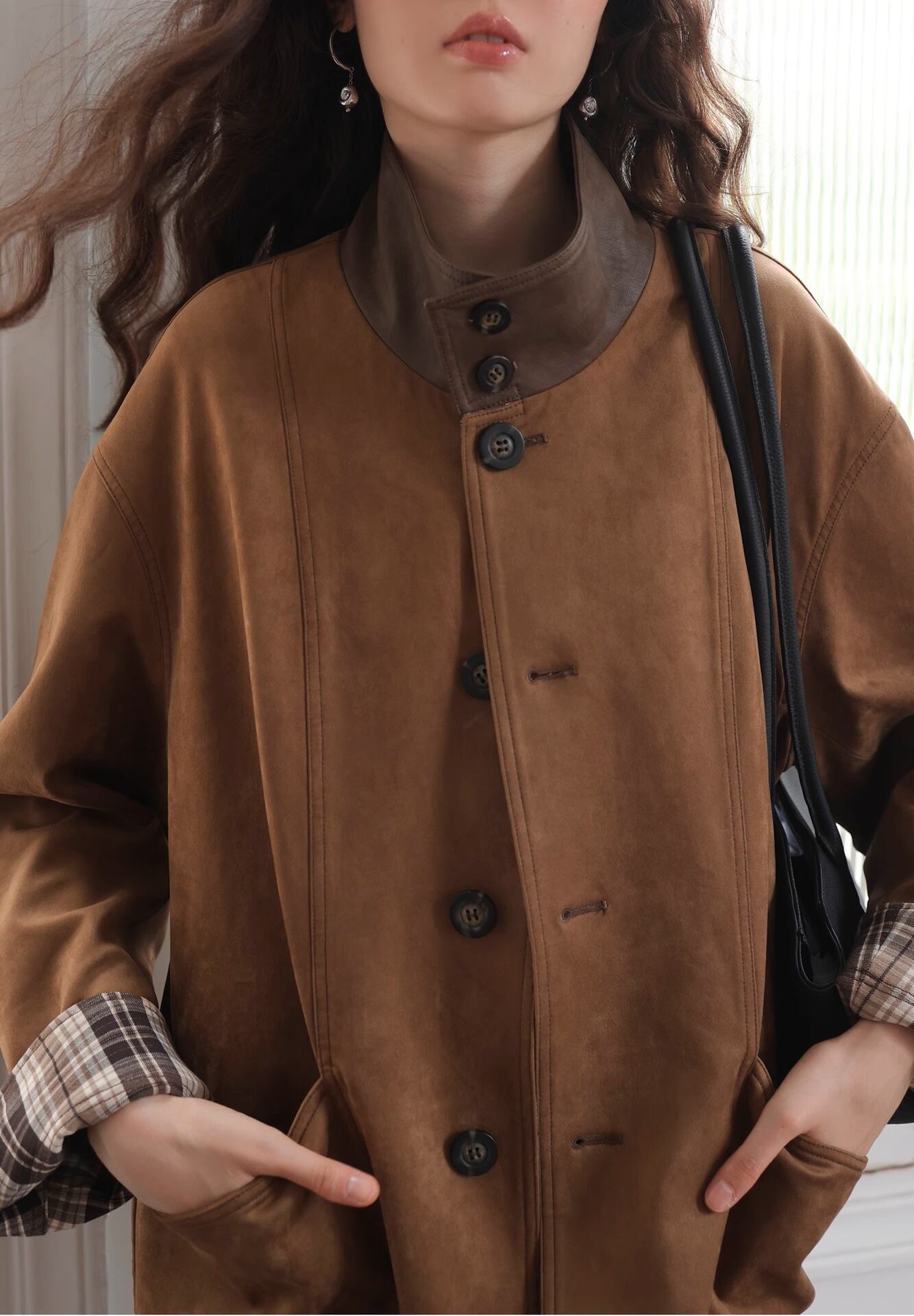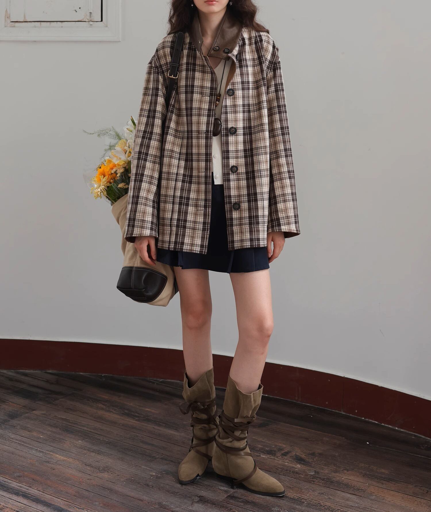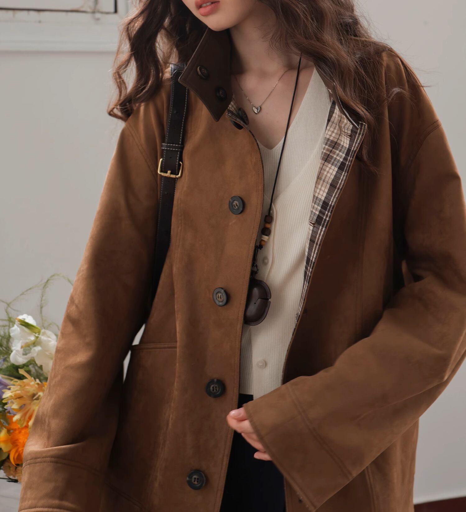 リバーシブル チェック柄 ミディアム ジャケット コート レディース トップス アウター 上着 羽織 丈長 長袖 襟付き スタンドカラー ハーフハイネック ポケット 前開き ボタン ヴィンテージ かわいい 大人可愛い シンプル カジュアル おしゃれ レトロ こなれ感 無地 チェック 格子柄 春 秋 冬 ママ 通勤 学生 学校 通学 デート お出かけ 旅行 公園 女子会 休日 重ね着 暖かい 体型カバー 普段使い 着回し レイヤード S M L 茶色 ブラウン