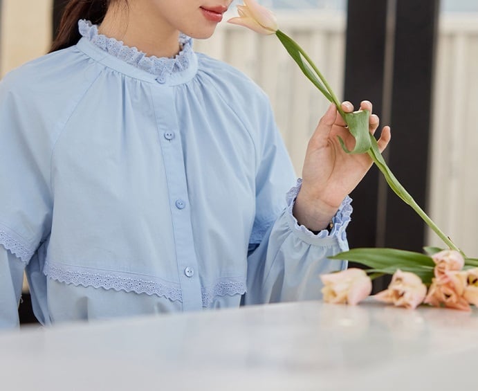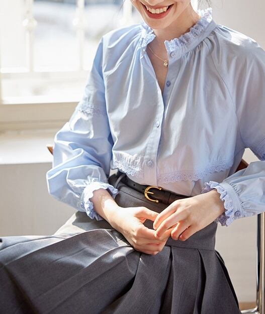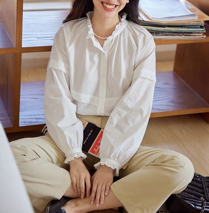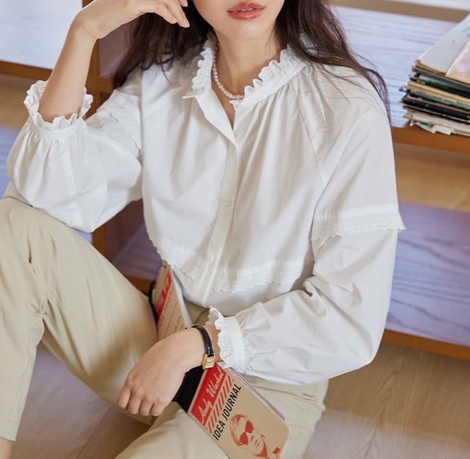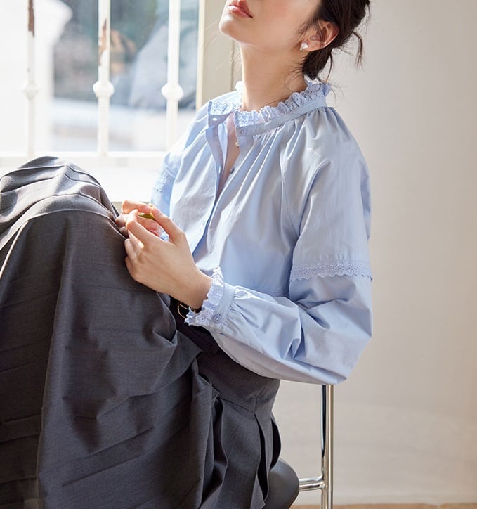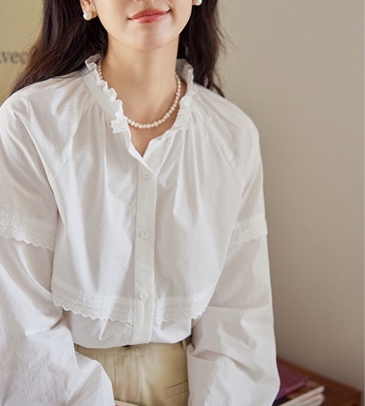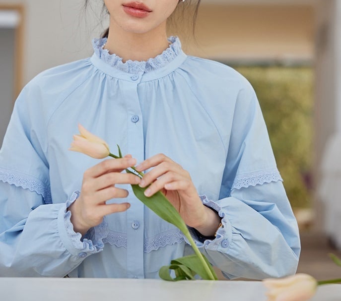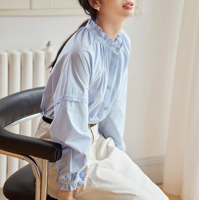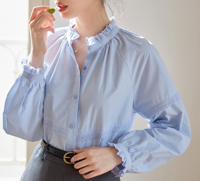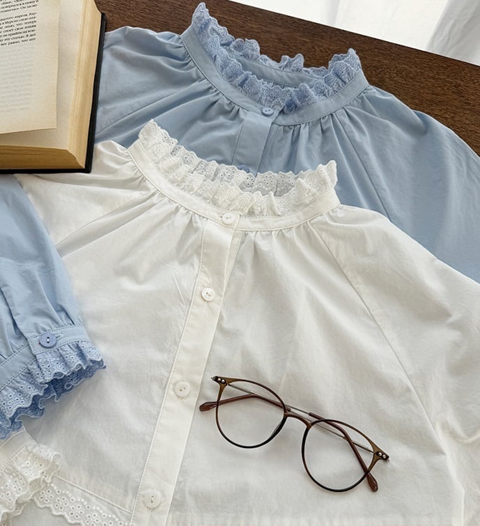 パンチングレース フリル 長袖 シャツ ブラウス レディース トップス シャツ ブラウス インナー 丈長 ミディアム 長袖 ラグラン 襟付き スタンドカラー レース付き 切り替え フェミニン レース 前開き かわいい 大人可愛い きれいめ シンプル カジュアル 上品 おしゃれ レトロ ガーリー クラシカル 無地 春 秋 冬 ママ 通勤 学生 学校 通学 デート お出かけ 旅行 公園 女子会 休日 ショッピング カフェ 重ね着 体型カバー 普段使い 着回し レイヤード S M ゆったり 白 ホワイト ブルー