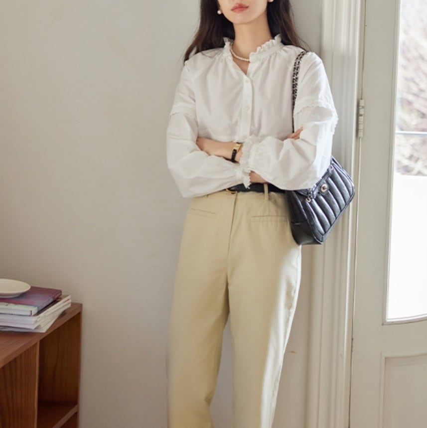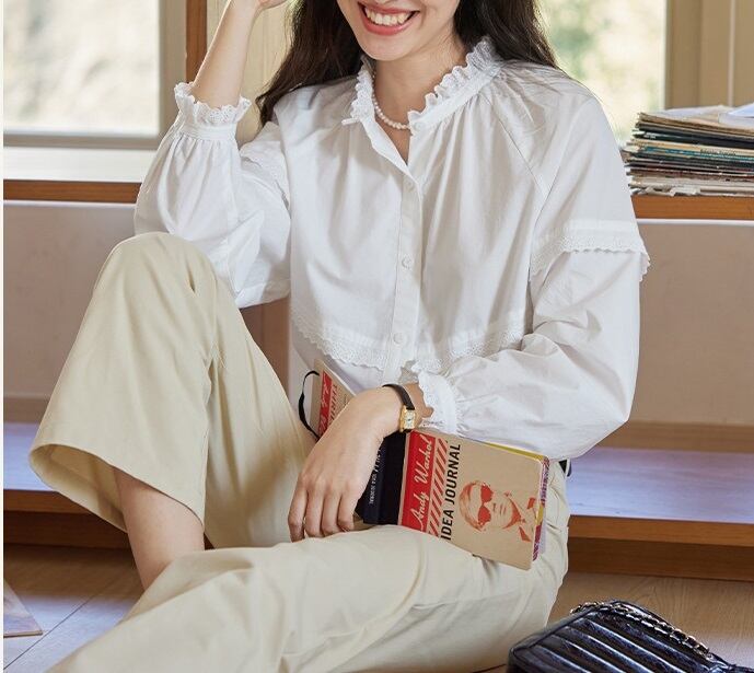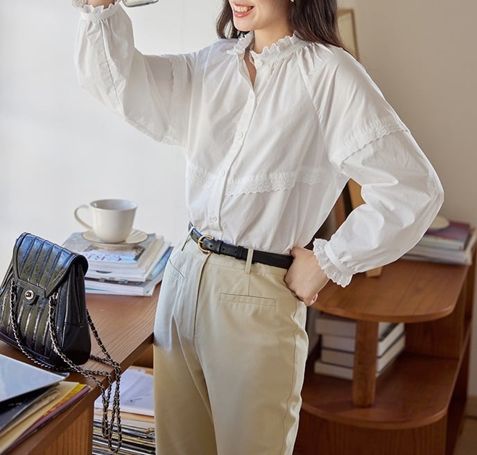 おしゃれで可愛い「パンチングレース フリル 長袖 シャツ ブラウス」のご紹介です!このブラウスは、フェミニンな印象を与えるパンチングレースのデザインと、エレガントなフリルが特徴です。長袖かつミディアム丈で、春・秋・冬の重ね着にもぴったりなアイテムです!