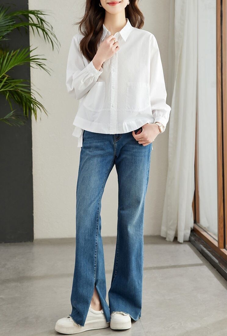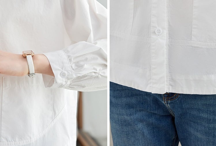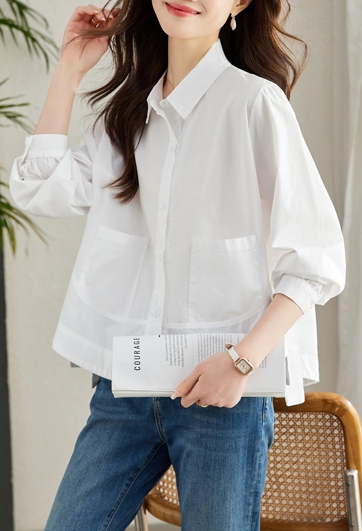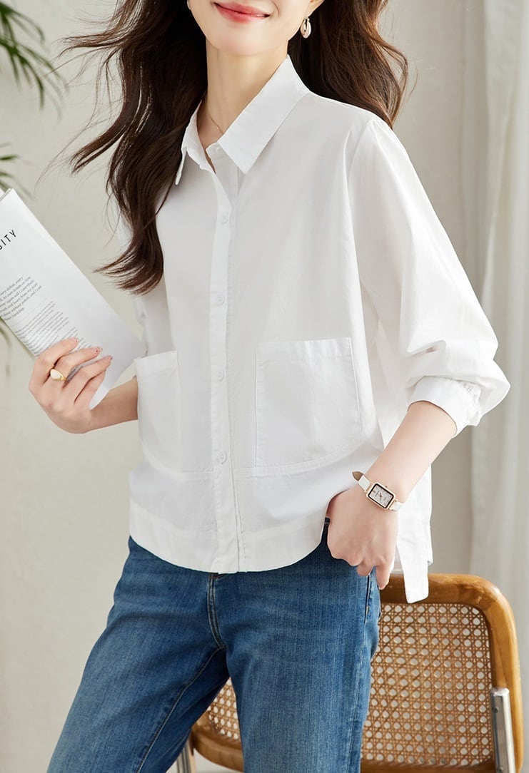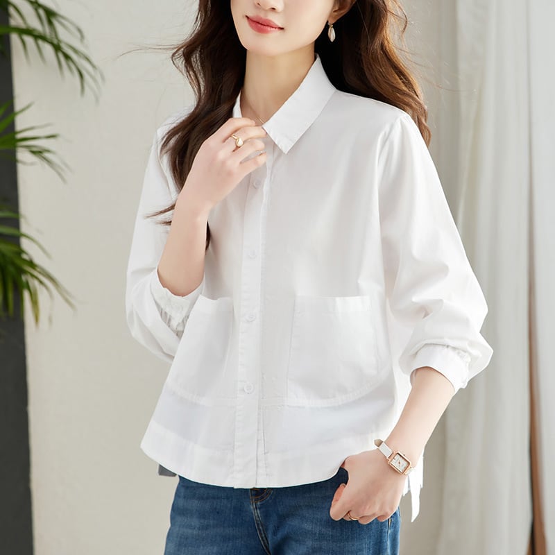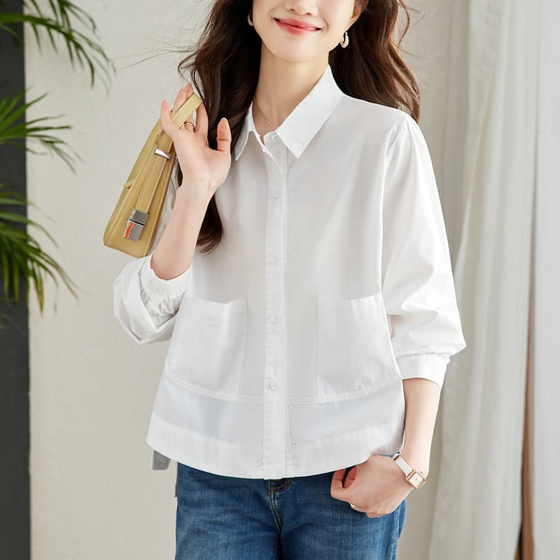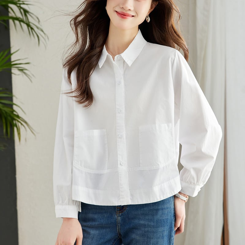 大きめポケット 長袖 シャツ ブラウス レディース トップス インナー ミディアム 長袖 襟付き 角襟 ポケット 前開き ボタン 綿 コットン かわいい 大人可愛い きれいめ シンプル カジュアル おしゃれ こなれ感 フォーマル ベーシック 無地 春 秋 冬 授業参観 会議 MTG ママ オフィス OL 通勤 学生 学校 通学 デート お出かけ 旅行 公園 女子会 休日 ショッピング カフェ 重ね着 体型カバー 普段使い 着回し レイヤード M L XL 2XL 大きいサイズ ゆったり 白 ホワイト