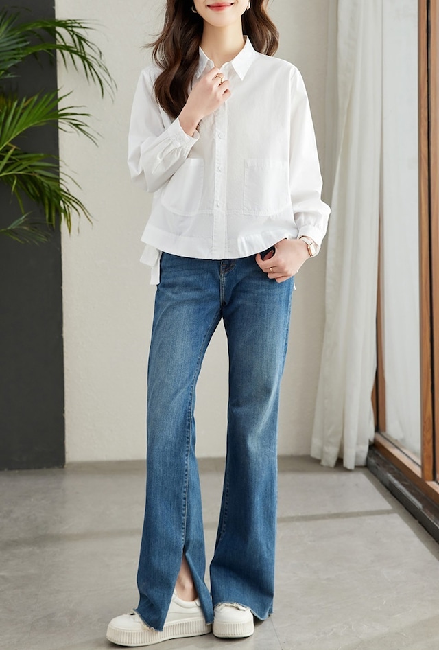 おしゃれで使い勝手抜群の「大きめポケット 長袖 シャツ ブラウス」のご紹介です!このシャツは、シンプルでありながら大人可愛い角襟デザインが特徴で、様々なシーンで大活躍します。前開きのボタン仕様が洗練された印象を与え、カジュアルからフォーマルまで幅広くお使いいただけるアイテムです。