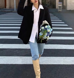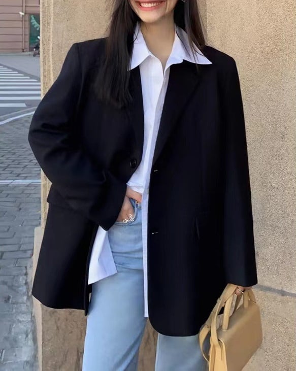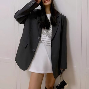 おしゃれで使い勝手抜群の「オーバーサイズ アシメ 長袖 テーラードジャケット」のご紹介です!このジャケットは、シンプルでありながら大人可愛い雰囲気を演出し、普段使いはもちろん、通勤やデート、旅行など幅広いシーンで活躍するアイテムです。