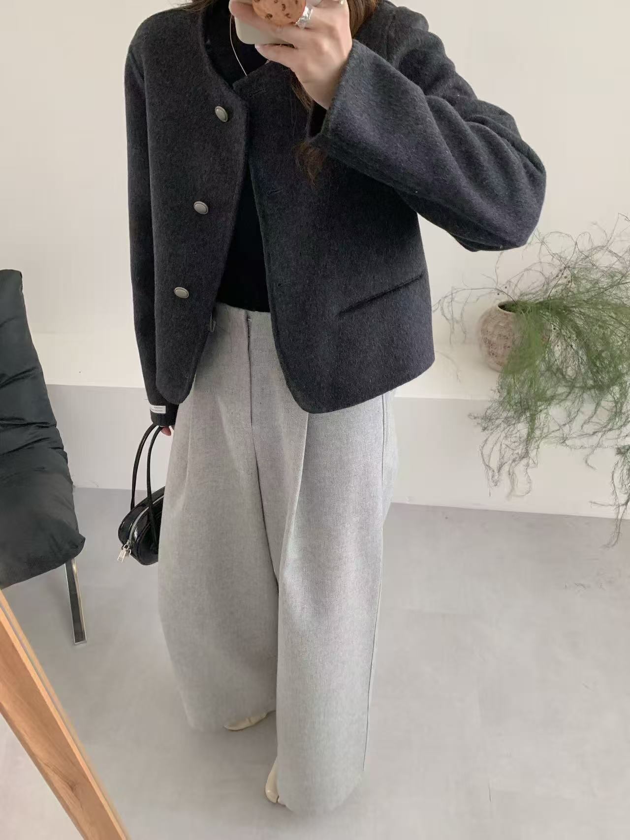 ノーカラーとフロントボタンのデザインが上品な印象を与え、ミディアム丈が体型カバーにも効果的です。長袖仕様で、シンプルな無地デザインはどんなコーディネートにも合わせやすく、重ね着もしやすい万能なアウターとなっています。また、淡めカラーが魅力を引き立て、おしゃれなこなれ感を演出します。