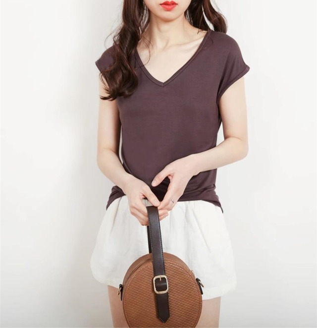 このTシャツは、フレンチスリーブとVネックデザインが特徴で、シンプルながらも大人可愛い印象を与えます。通勤や通学、デート、お出かけ、旅行、女子会など、春、夏、秋の様々なシーンで大活躍するアイテムです。