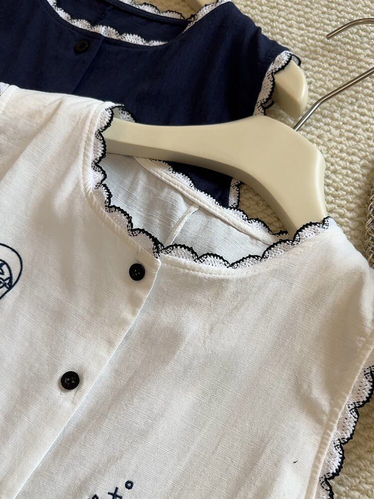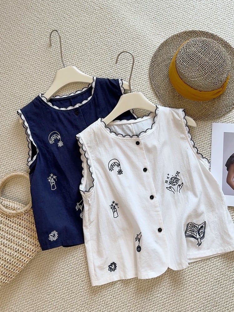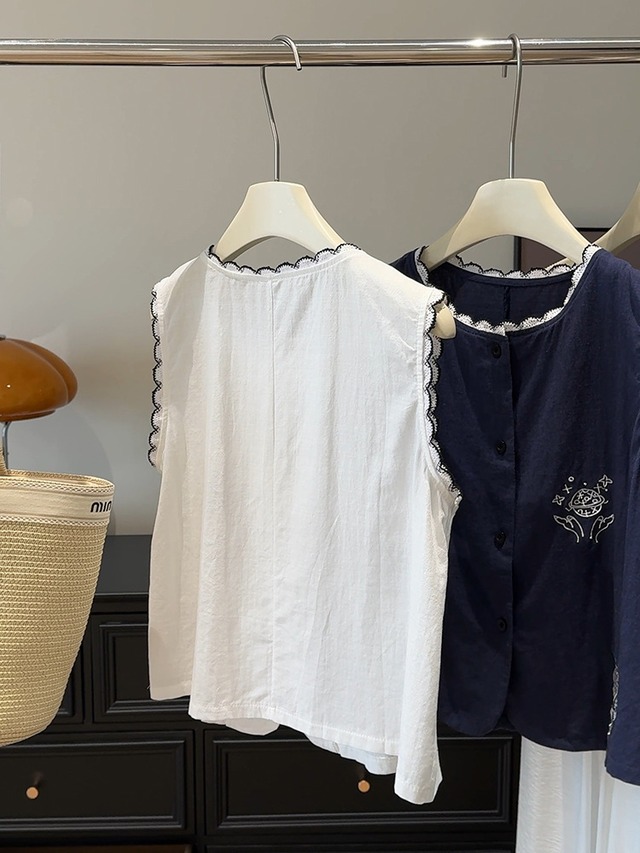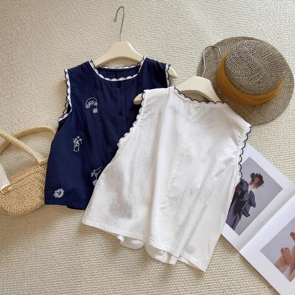 刺繍柄 フロントボタン ノースリーブ シャツ レディース トップス ブラウス ミディアム 袖なし ノースリーブ ラウンドネック 襟付き スタンドカラー レース付き スカラップ レース 刺繍 前開き ボタン かわいい 大人可愛い シンプル カジュアル おしゃれ レトロ こなれ感 ルーズ 個性的 存在感 春 夏 秋 ママ 通勤 学生 学校 通学 デート お出かけ 旅行 公園 女子会 休日 ショッピング カフェ 重ね着 体型カバー 普段使い 着回し レイヤード ゆったり 白 ホワイト ネイビー