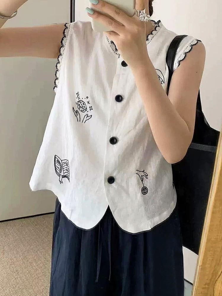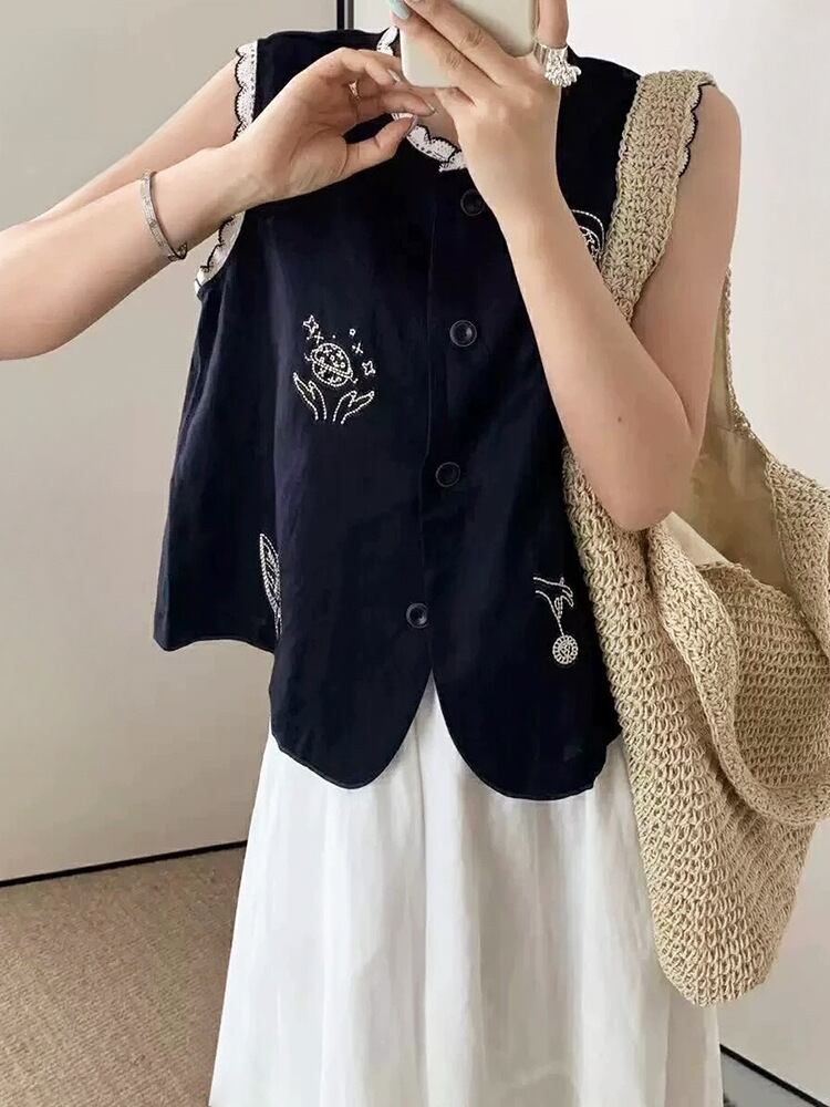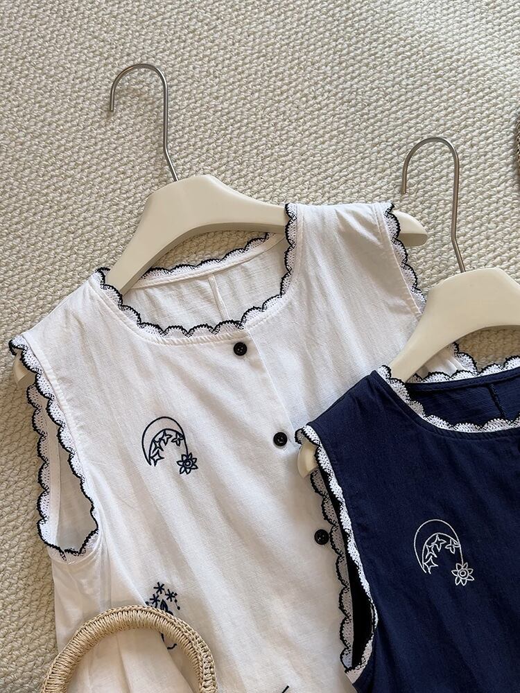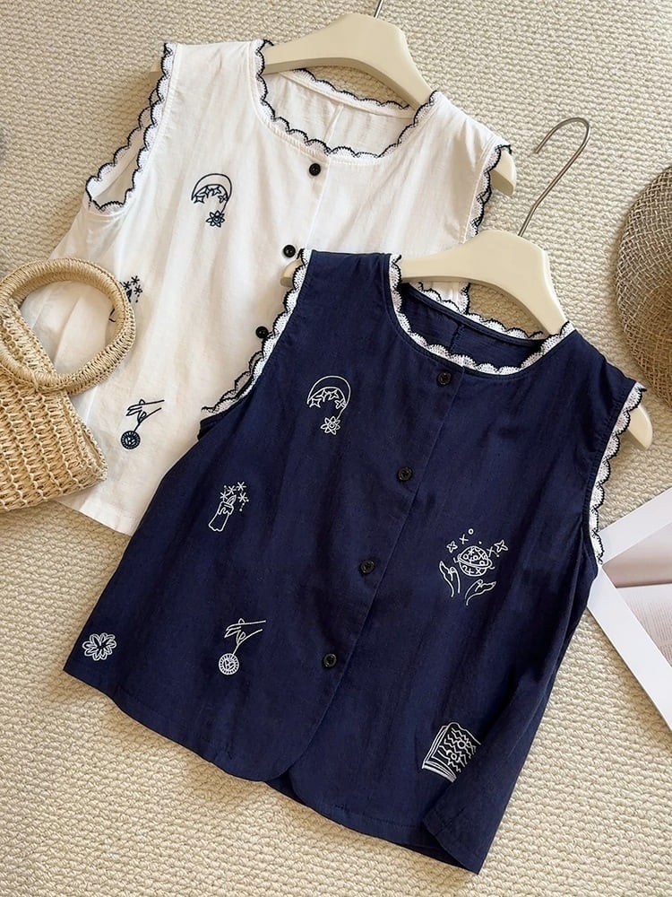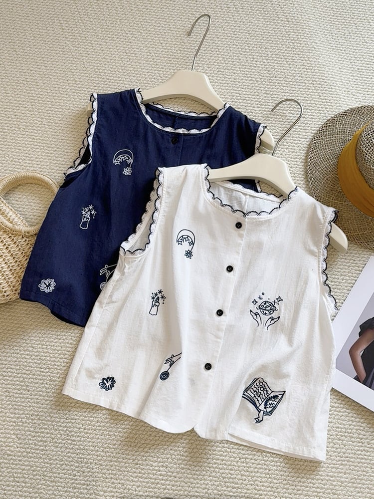 刺繍柄 フロントボタン ノースリーブ シャツ レディース トップス ブラウス ミディアム 袖なし ノースリーブ ラウンドネック 襟付き スタンドカラー レース付き スカラップ レース 刺繍 前開き ボタン かわいい 大人可愛い シンプル カジュアル おしゃれ レトロ こなれ感 ルーズ 個性的 存在感 春 夏 秋 ママ 通勤 学生 学校 通学 デート お出かけ 旅行 公園 女子会 休日 ショッピング カフェ 重ね着 体型カバー 普段使い 着回し レイヤード ゆったり 白 ホワイト ネイビー