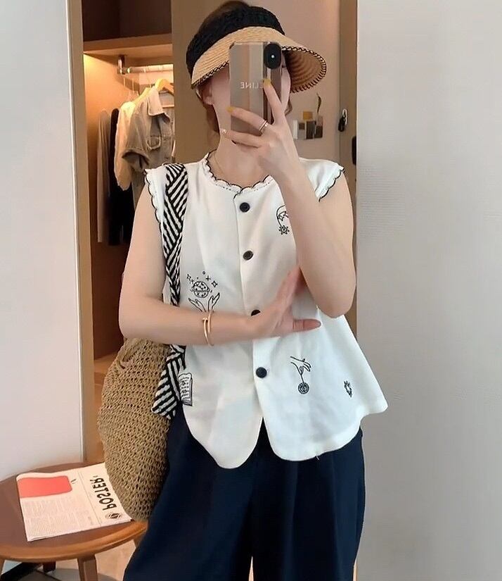 おしゃれで華やかな「刺繍柄 フロントボタン ノースリーブ シャツ」のご紹介です!