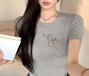 羽モチーフ ビジュー装飾 ラウンドネック ショート丈 半袖 Tシャツ レディース トップス カットソー プルオーバー インナー ショート ミディアム 半袖 襟なし スリム 細身 へそ出し ビジュー 綿 コットン かわいい 大人可愛い きれいめ シンプル カジュアル おしゃれ こなれ感 存在感 プリント バックプリント ロゴ 英字 フェザー柄 春 夏 秋 ママ 通勤 学生 学校 通学 デート お出かけ 旅行 公園 女子会 休日 重ね着 普段使い 着回し レイヤード S M L XL 白 ホワイト グレー