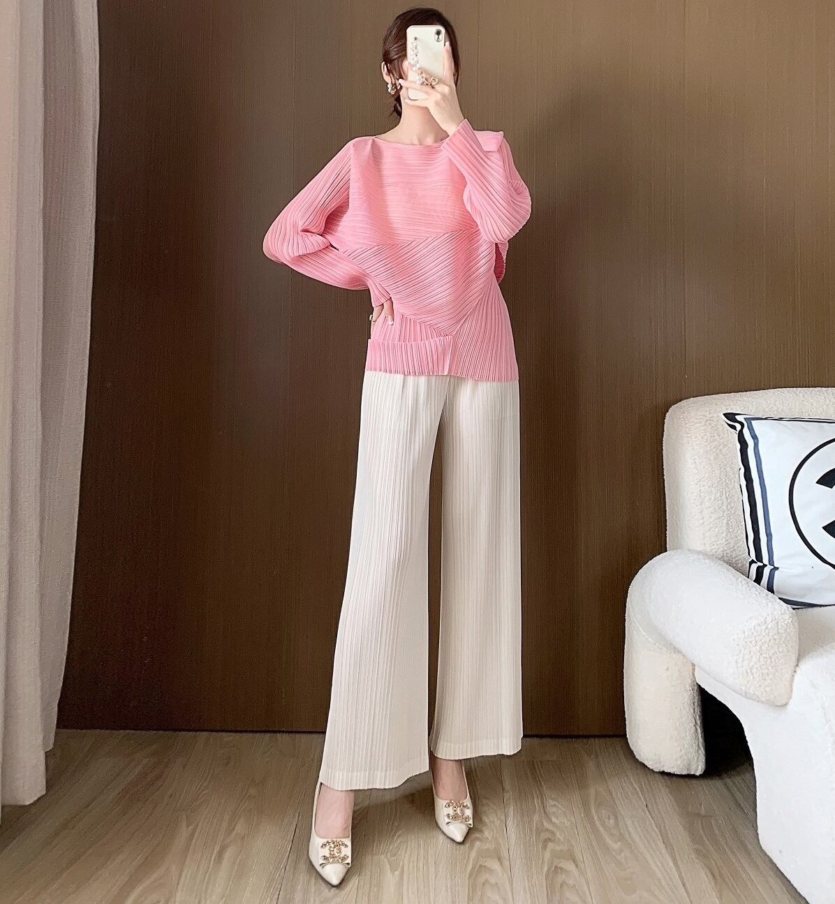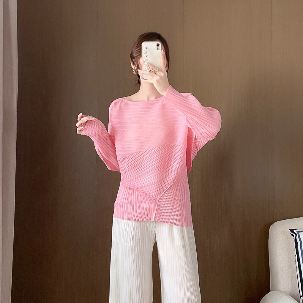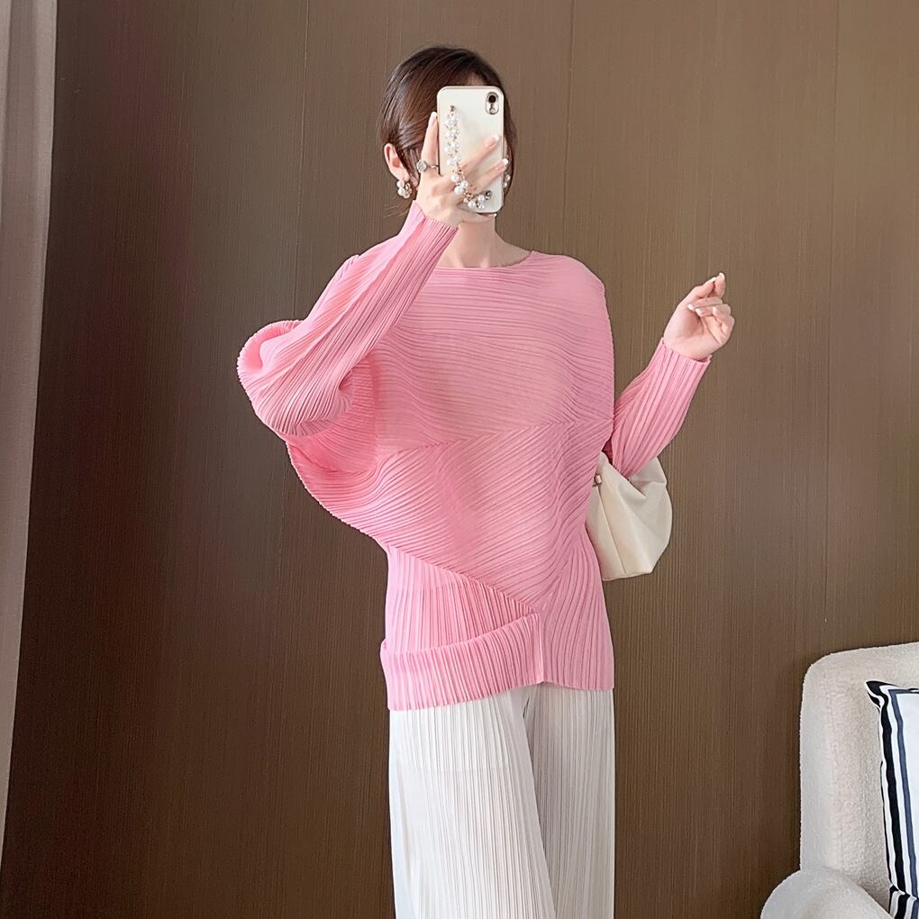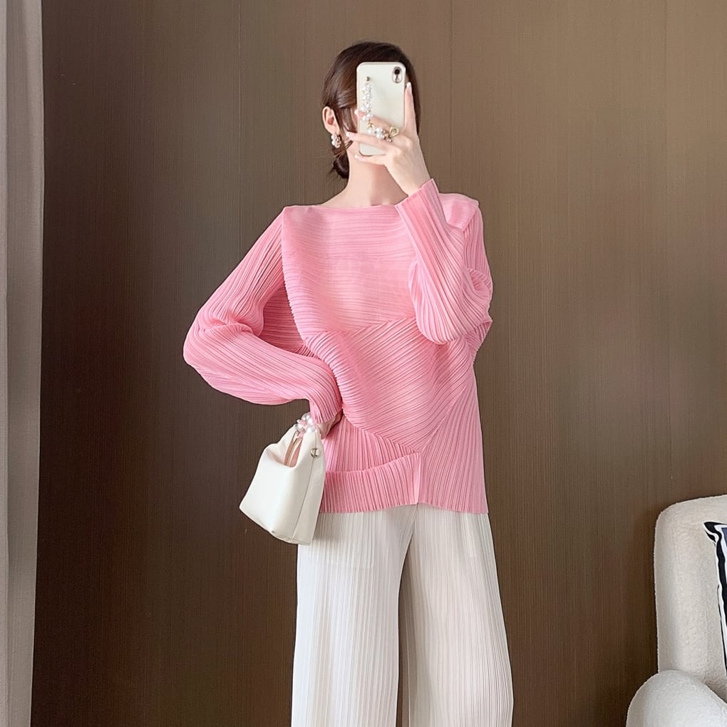 このトップスは、アシンメトリーなデザインとフェミニンなプリーツが魅力。ゆとりのあるドルマンスリーブがアクセントになり、女性らしさを引き立てます。また、ラウンドネックとボートネックの2Way仕様が、さまざまなシーンでの着用を可能にします。自宅での普段使いはもちろん、授業参観や会議、デートや休日のお出かけまでおしゃれに決まる一着です!