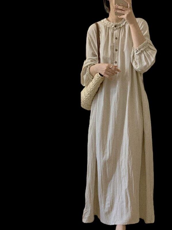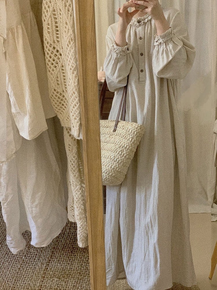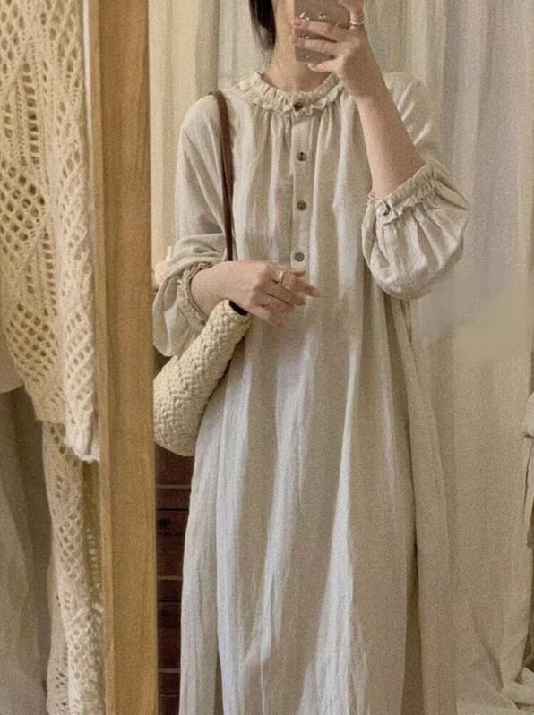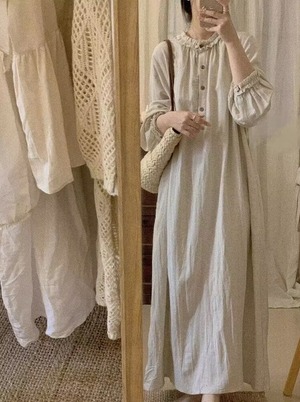 このワンピースは、エレガントなフリルカラーとフロントボタンが特徴で、膝下のマキシ丈が美しいシルエットを作り出します。長袖デザインとラウンドネックは、シンプルでありながら大人可愛い印象を与えてくれます☆ゆったりとしたルーズ感があり、体型カバー効果も抜群です!
