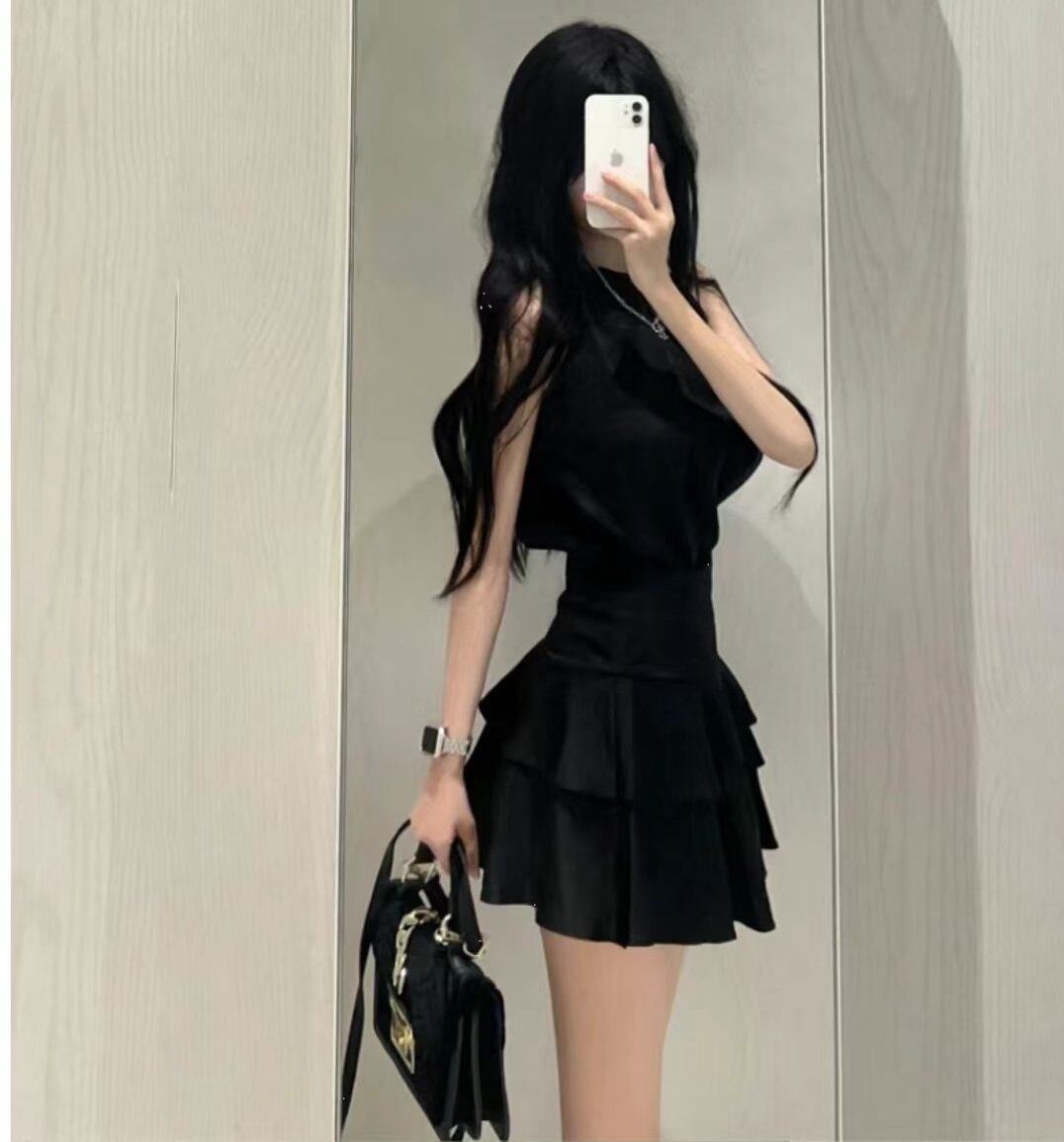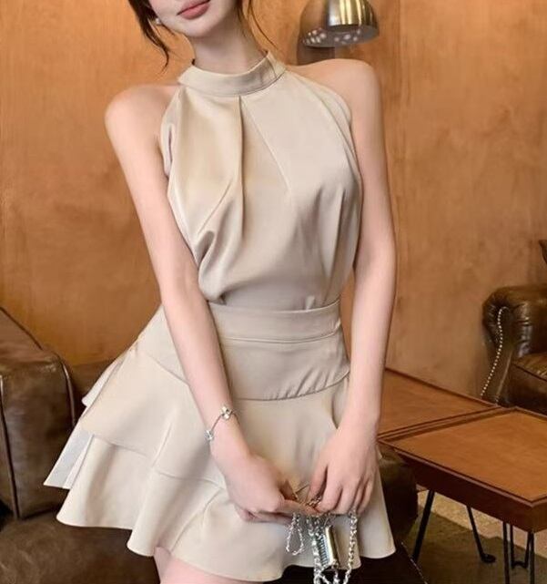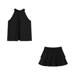 このセットアップは、ホルターネックデザインのトップスと、流れるようなフレアシルエットのミニスカートが特徴です☆ノースリーブのスタイルが涼しげで、春夏秋のシーズンにも大活躍!ハイウエストのデザインにより、脚長効果があり、おしゃれな印象を与えます。