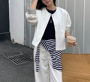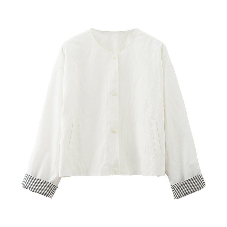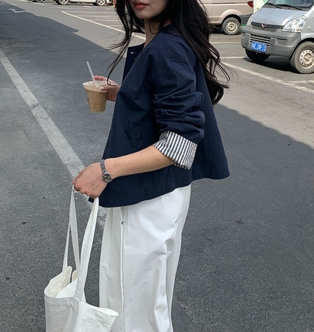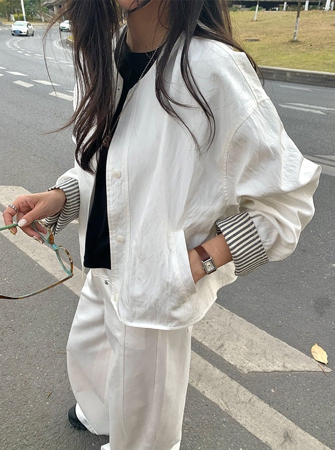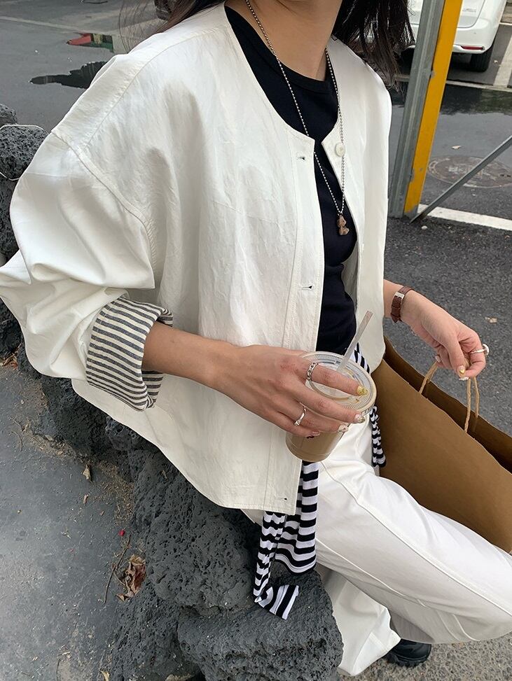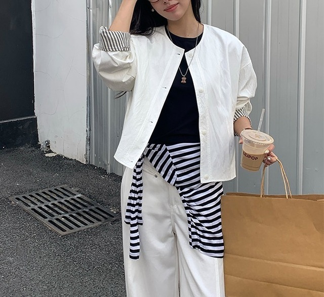 裏地付き ストライプ柄 長袖 ショート丈 ジャケット レディース トップス アウター 上着 ショート ドロップショルダー ラウンドネック 襟なし ノーカラー 前開き ボタン バイカラー 配色 かわいい 大人可愛い シンプル カジュアル おしゃれ こなれ感 ボーイッシュ 無地 ストライプ 春 秋 ママ 通勤 学生 学校 通学 デート お出かけ 旅行 公園 女子会 休日 ショッピング カフェ 重ね着 韓国 体型カバー 普段使い 着回し レイヤード ロールアップ ゆったり フリーサイズ 白 ホワイト ネイビー