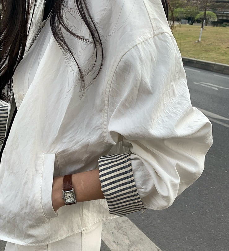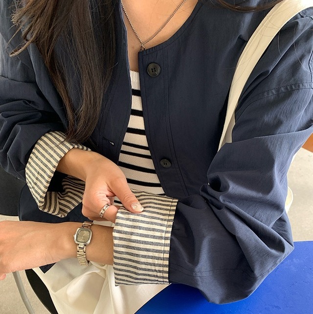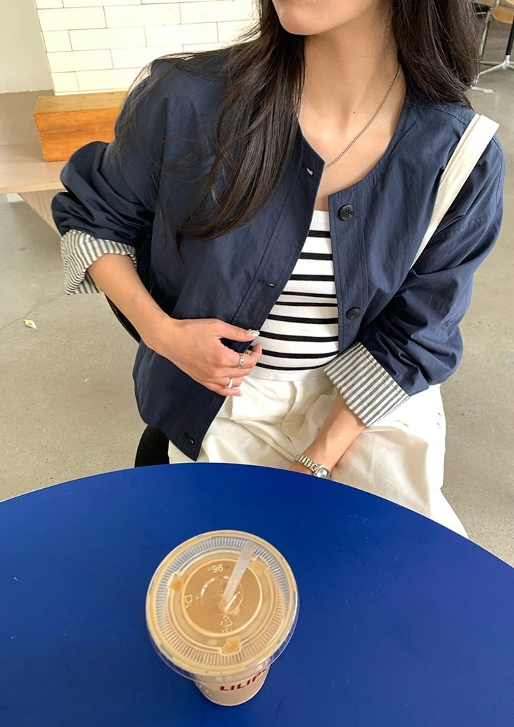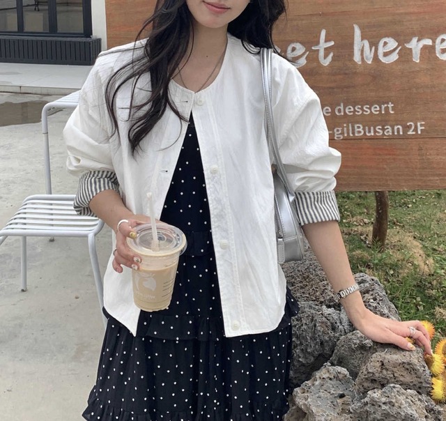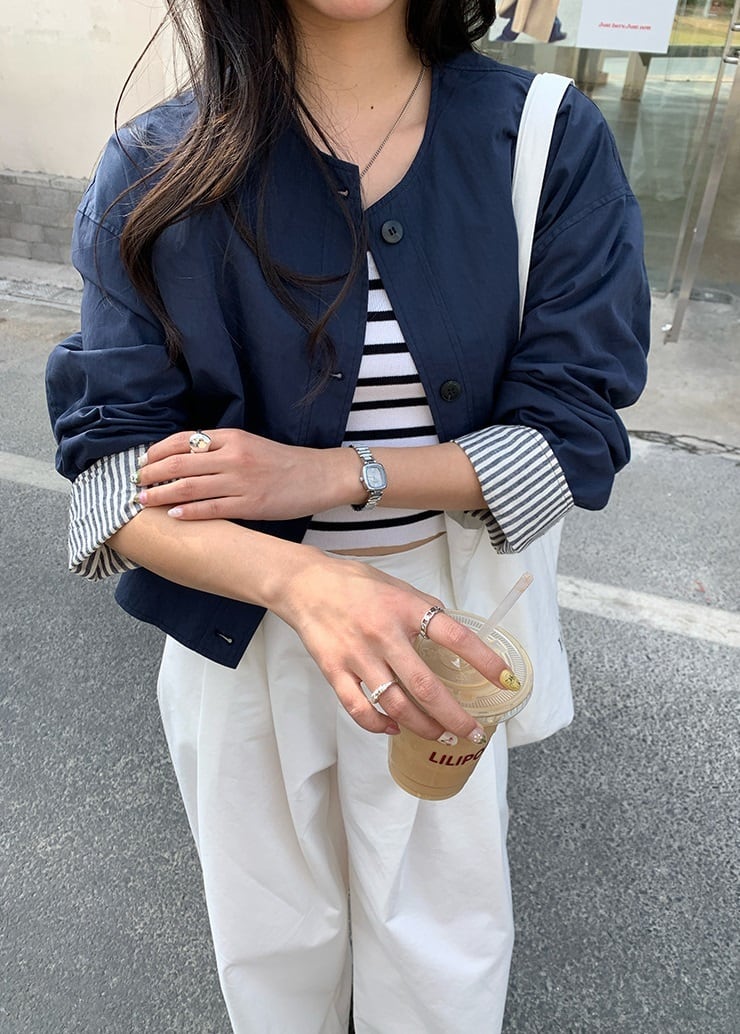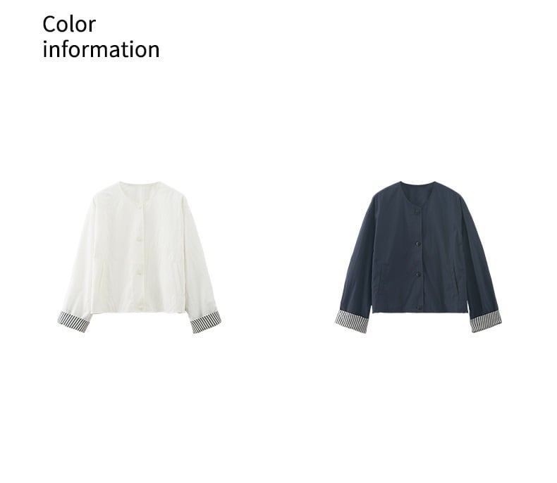 裏地付き ストライプ柄 長袖 ショート丈 ジャケット レディース トップス アウター 上着 ショート ドロップショルダー ラウンドネック 襟なし ノーカラー 前開き ボタン バイカラー 配色 かわいい 大人可愛い シンプル カジュアル おしゃれ こなれ感 ボーイッシュ 無地 ストライプ 春 秋 ママ 通勤 学生 学校 通学 デート お出かけ 旅行 公園 女子会 休日 ショッピング カフェ 重ね着 韓国 体型カバー 普段使い 着回し レイヤード ロールアップ ゆったり フリーサイズ 白 ホワイト ネイビー