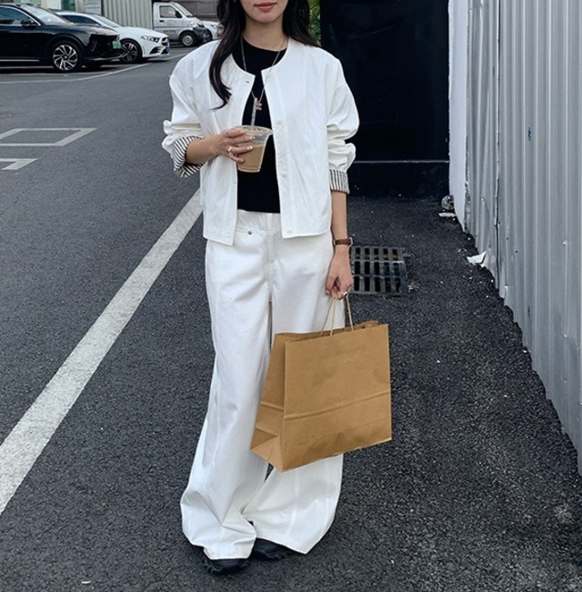 このジャケットは、裏地付きのストライプ柄で、ショート丈のスタイリッシュなデザインが特徴です☆ドロップショルダーやラウンドネックの襟なしデザインで、カジュアルながらも洗練された雰囲気を演出します!バイカラーの配色がアクセントとなり、シンプルなコーディネートにこなれ感をプラスしてくれます。