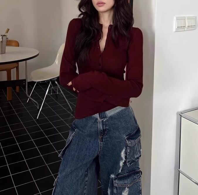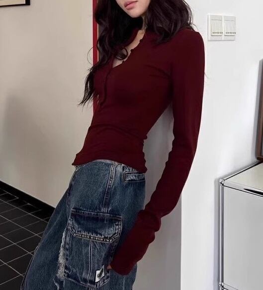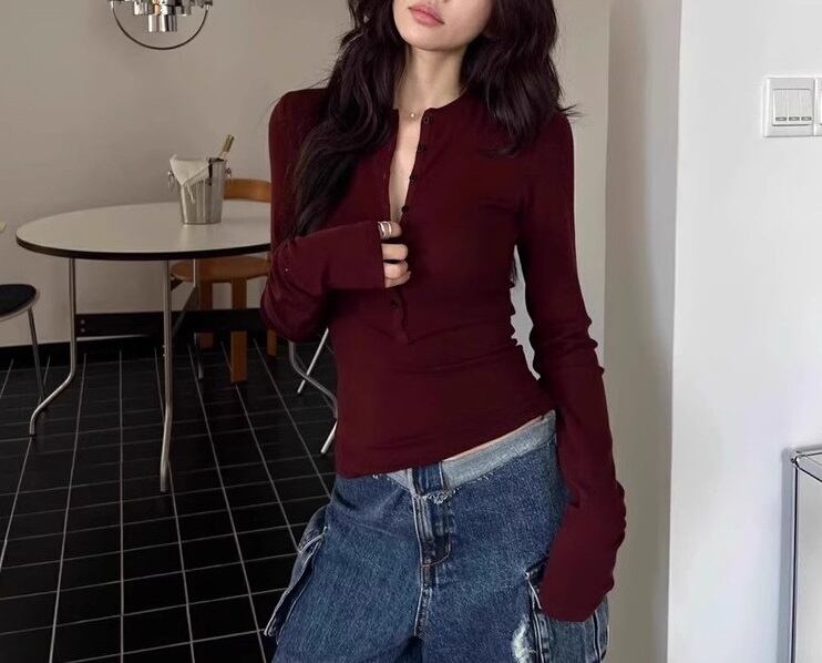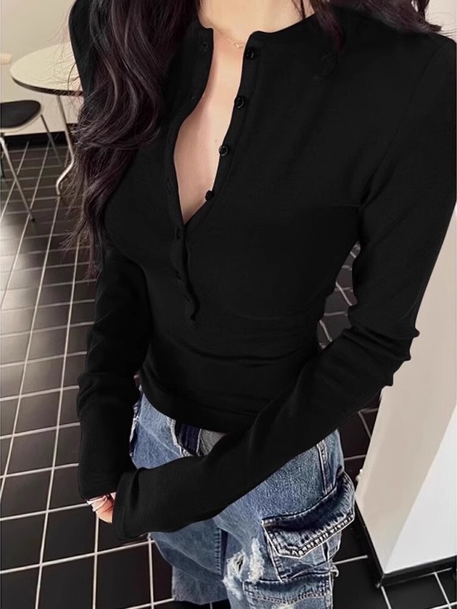 ハーフボタン スリム 長袖 ロンT レディース トップス カットソー プルオーバー ミディアム 長袖 ラウンドネック 襟なし 細身 ボタン かわいい 大人可愛い シンプル カジュアル おしゃれ こなれ感 無地 春 秋 冬 ママ 通勤 学生 学校 通学 デート お出かけ 旅行 公園 女子会 休日 ショッピング カフェ 重ね着 韓国 オルチャン 普段使い 着回し レイヤード S M L XL 黒 ブラック グレー ワインレッド