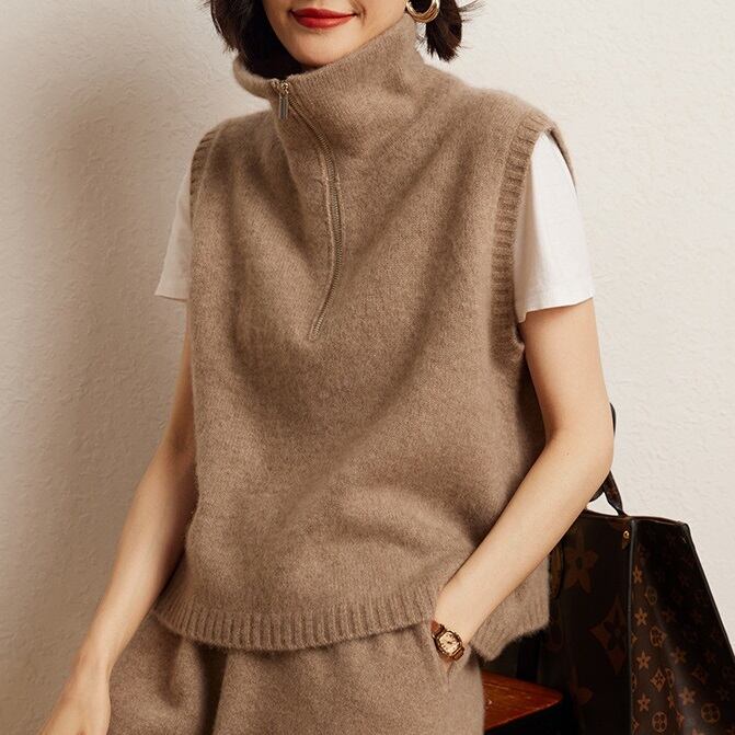 襟付き ジップアップ ノースリーブ ニットベスト レディース トップス ニット セーター プルオーバー ベスト ミディアム 袖なし ハイネック スタンドカラー ふわふわ ファスナー ジッパー チャック かわいい 大人可愛い きれいめ シンプル カジュアル おしゃれ こなれ感 ルーズ 無地 春 夏 秋 冬 ママ 通勤 学生 学校 通学 デート お出かけ 旅行 公園 女子会 休日 ショッピング カフェ 重ね着 暖かい 体型カバー 普段使い 着回し ゆったり フリーサイズ 白 ホワイト ダークグレー カーキ