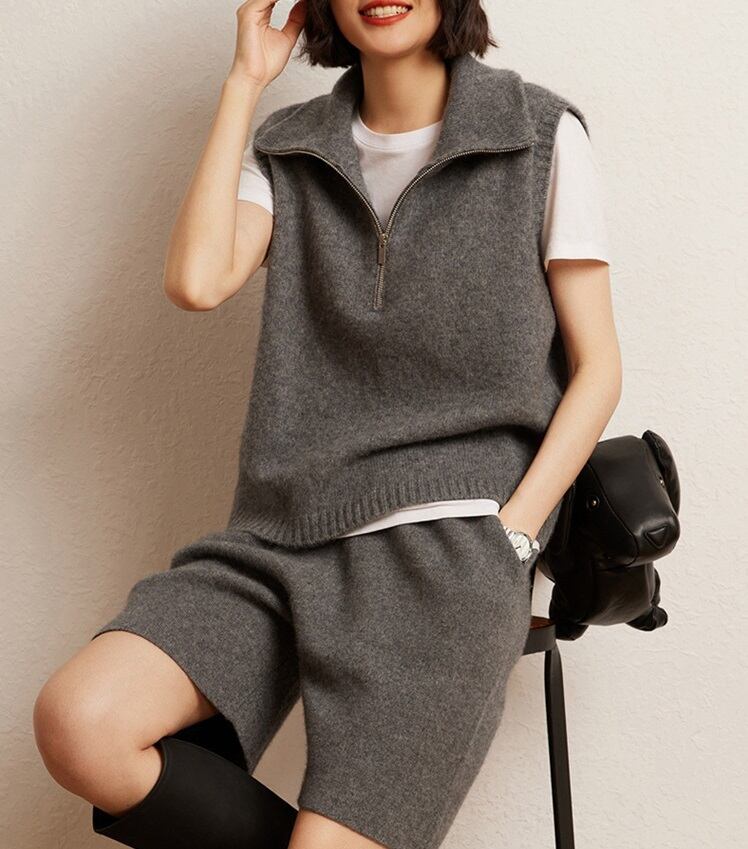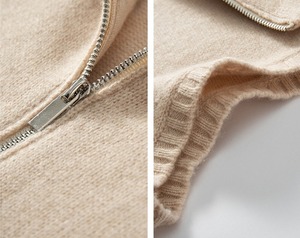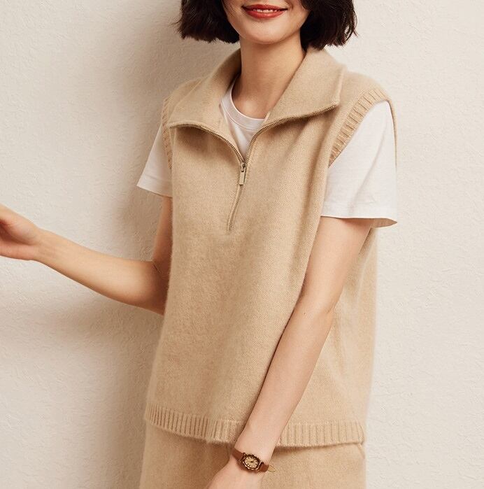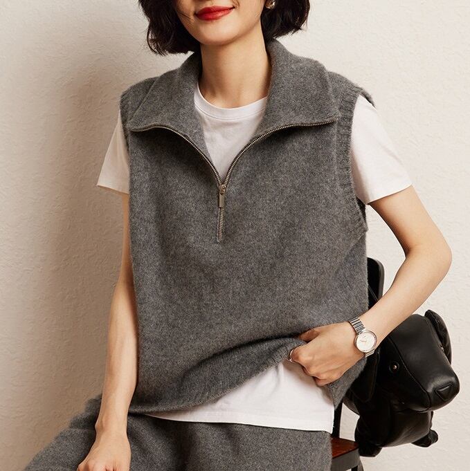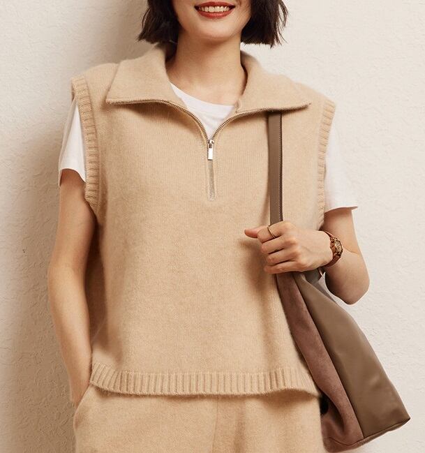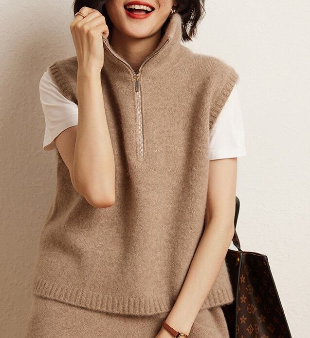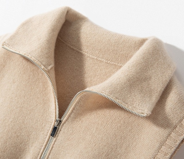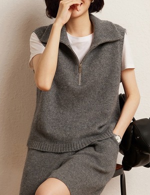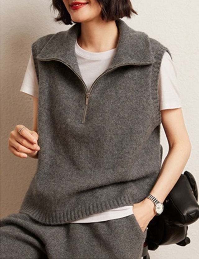 おしゃれで可愛い「襟付き ジップアップ ノースリーブ ニットベスト」のご案内です!ハイネックのスタンドカラーが特徴的で、シンプルながらも一際目を引くデザインに仕上がっています。涼しげなノースリーブスタイルは春夏にぴったりで、重ね着を楽しむことで秋冬にも活躍します☆