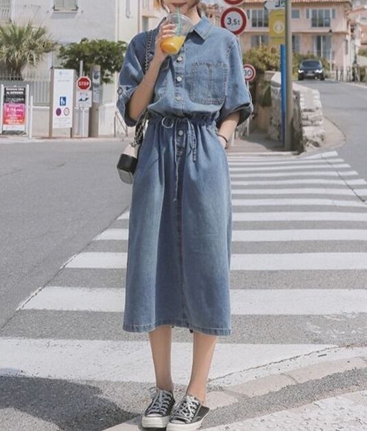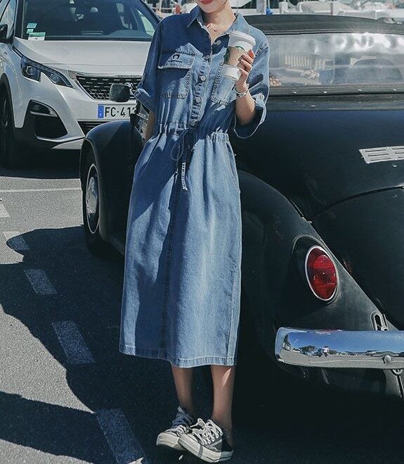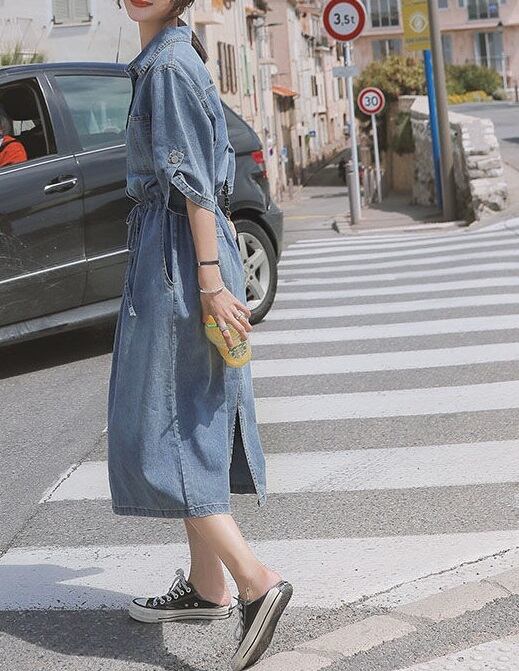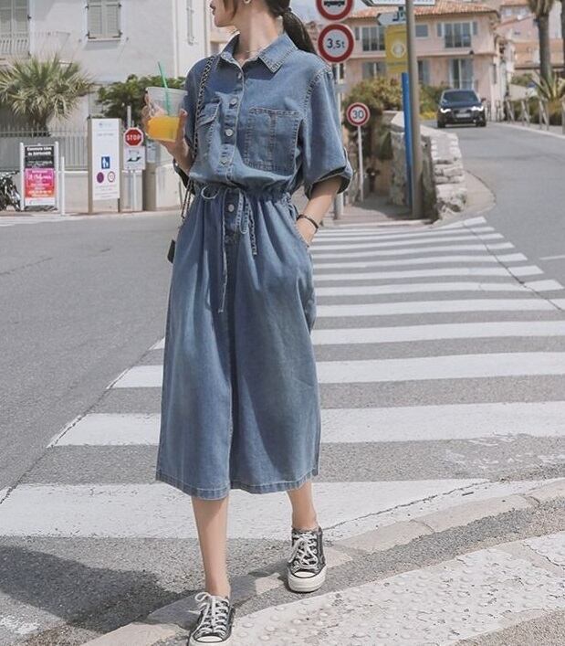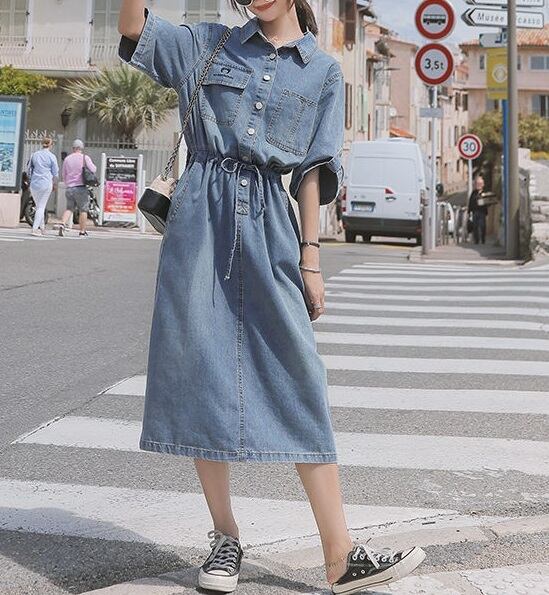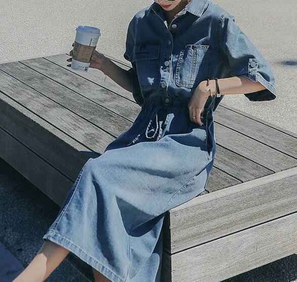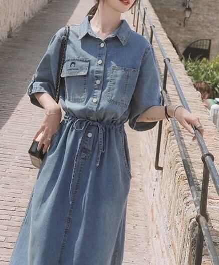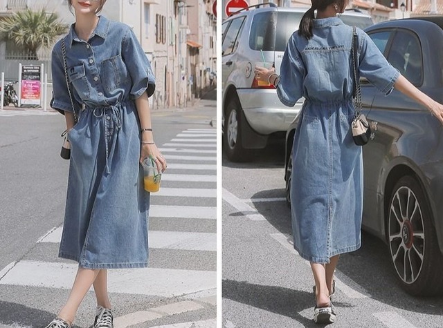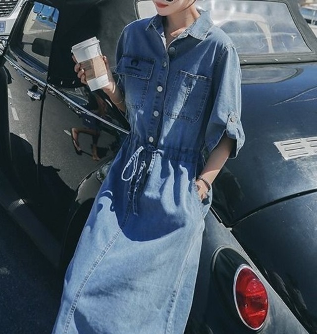 おしゃれで可愛い「ウエストリボン ミモレ丈 五分袖 デニムワンピース」のご案内です!ウエストリボンがアクセントとなり、ミモレ丈と五分袖のデザインが大人可愛い印象を与えます。デニム素材なので、カジュアルに幅広く楽しめる一枚です☆