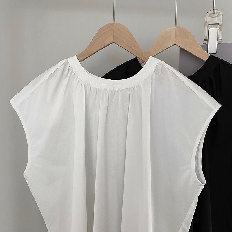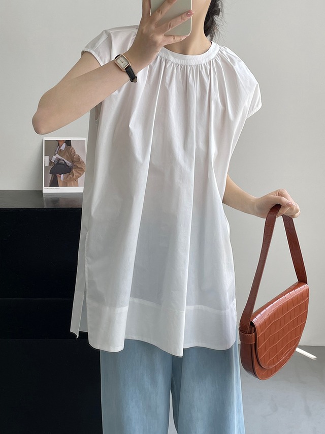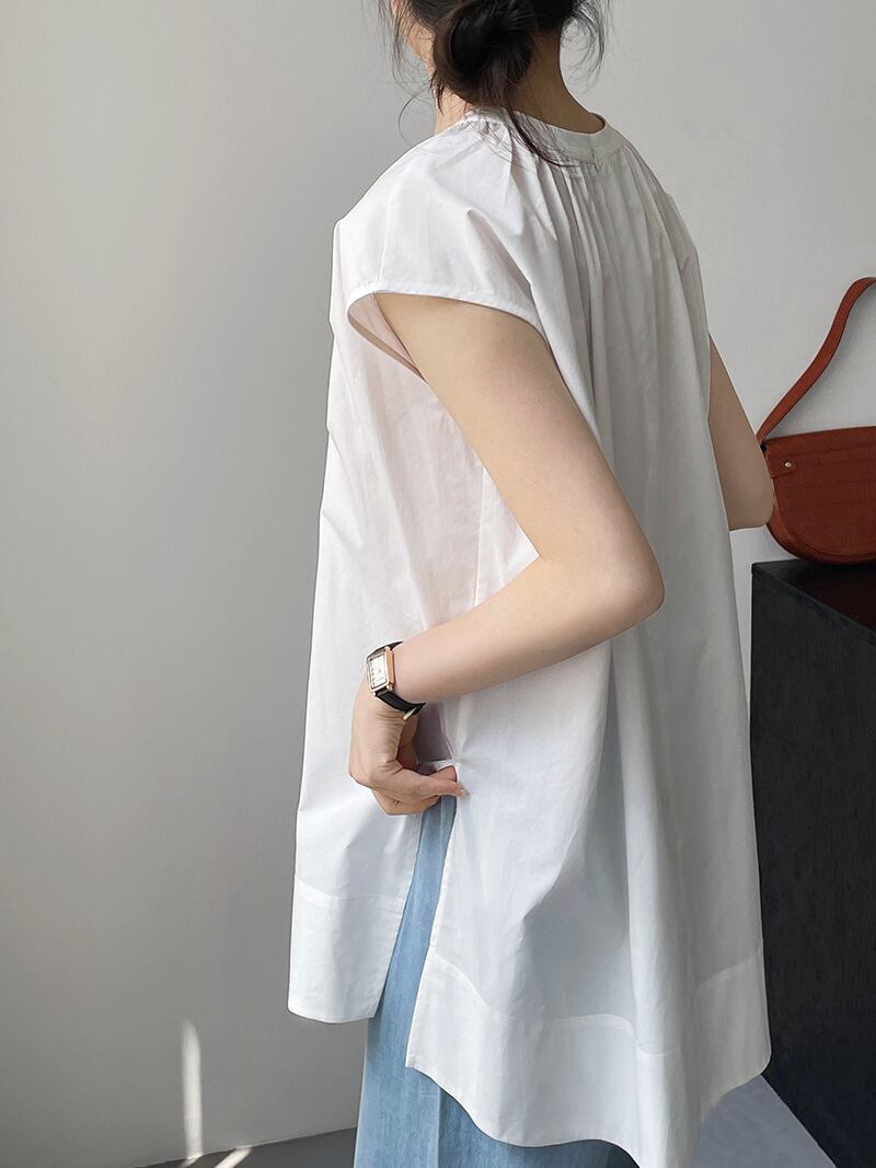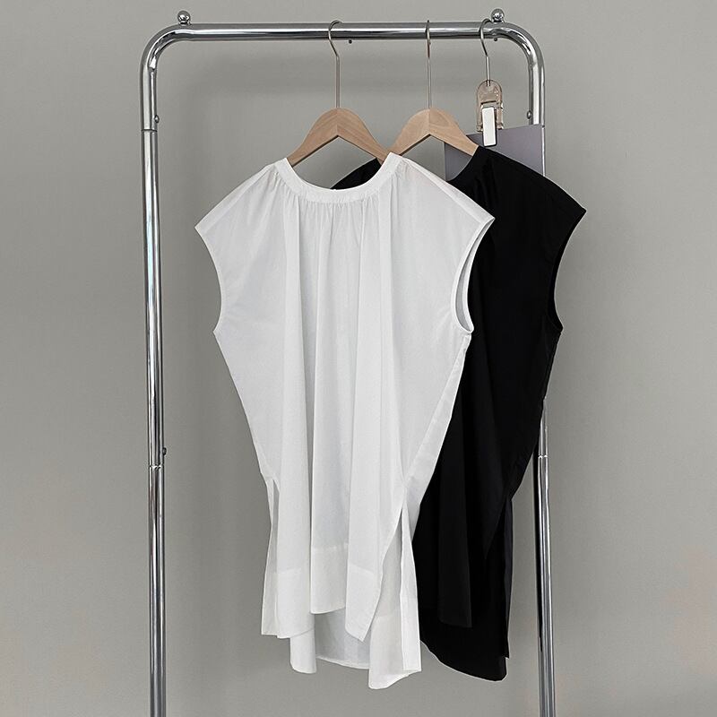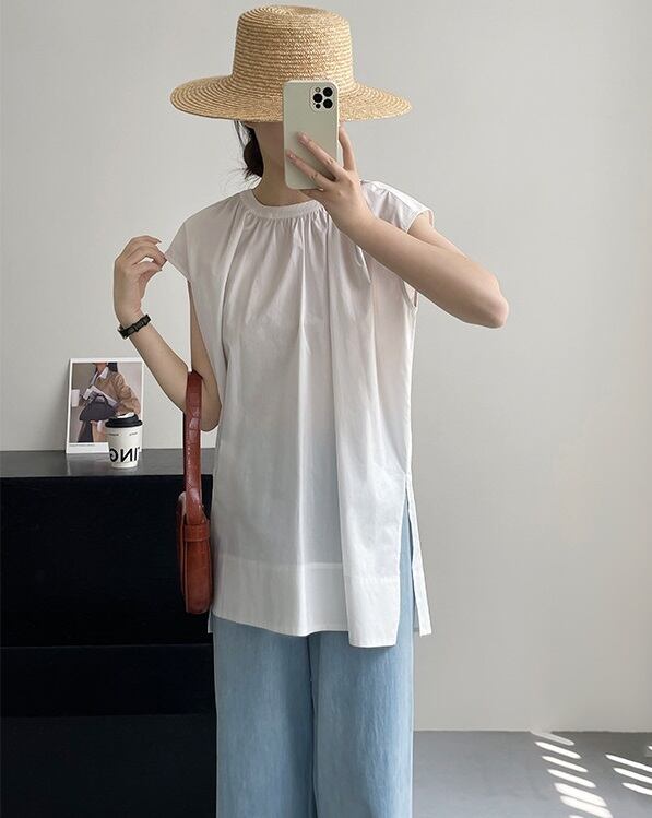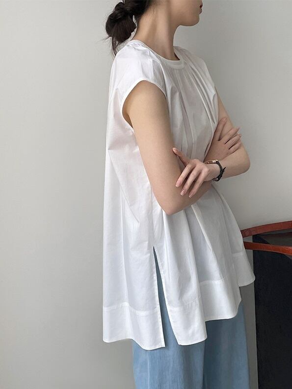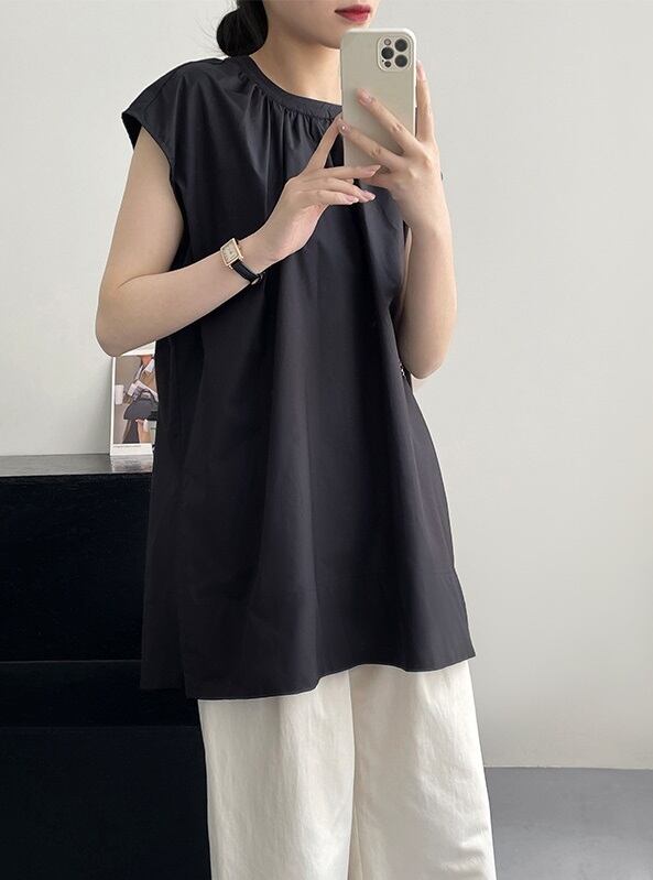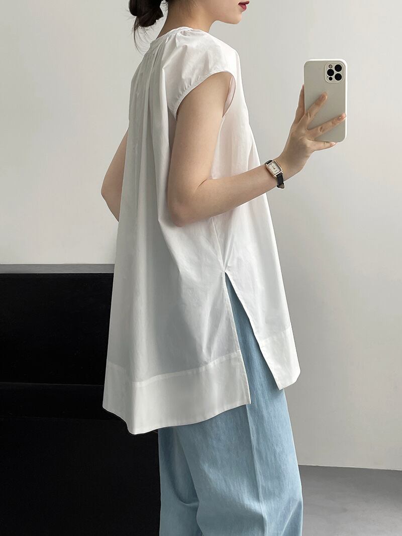 スリット入り ラウンドネック フレンチスリーブ シャツ ブラウス レディース トップス プルオーバー チュニック 丈長 ミディアム 袖なし ノースリーブ 襟なし ドレープ スリット サイドスリット ギャザー 綿 コットン かわいい 大人可愛い きれいめ シンプル カジュアル おしゃれ こなれ感 ルーズ ナチュラル 無地 春 夏 秋 ママ 通勤 学生 学校 通学 デート お出かけ 旅行 公園 女子会 休日 重ね着 楽ちん 体型カバー 普段使い 着回し レイヤード M L ゆったり 白 ホワイト 黒 ブラック