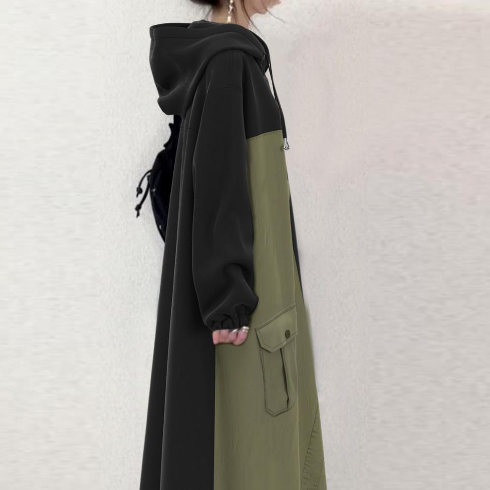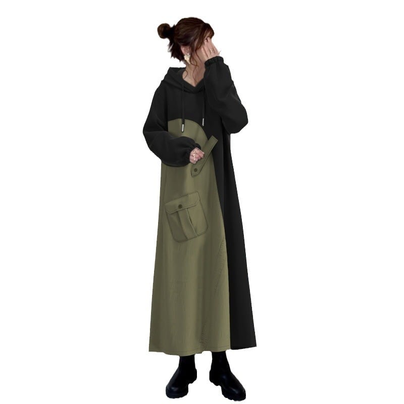 フード付き スウェットパーカー ロング丈ワンピース レディース ワンピース 膝下 ロング マキシ 長袖 フード Aライン 切り替え ドレープ ポケット ドロスト ボタン 切り替えデザイン バイカラー 配色 異素材ミックス かわいい 大人可愛い シンプル カジュアル おしゃれ こなれ感 ラフ ルーズ 個性的 主役級 存在感 無地 春 秋 冬 ママ 通勤 学生 学校 通学 デート お出かけ 旅行 公園 女子会 休日 楽ちん 体型カバー 普段使い 着回し S M L ゆったり 黒 ブラック