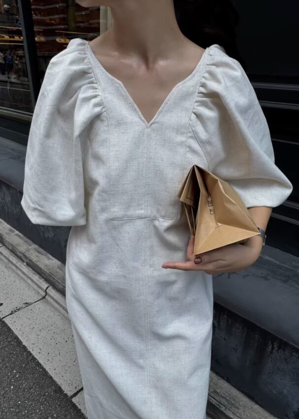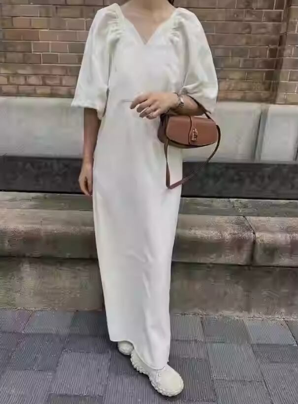 Vネック 五分袖 マキシ丈ワンピース レディース ワンピース サマーワンピ 膝下 ロング マキシ 5分袖 パフスリーブ Vネック 襟なし Iライン 背中開き スリット サイドスリット バックコンシャス ファスナー 背面ジッパー かわいい 大人可愛い シンプル カジュアル おしゃれ レトロ こなれ感 無地 春 夏 秋 ママ 通勤 学生 学校 通学 デート お出かけ 旅行 公園 女子会 休日 ショッピング カフェ 楽ちん 体型カバー 普段使い 着回し ゆったり フリーサイズ 白 ホワイト 黒 ブラック