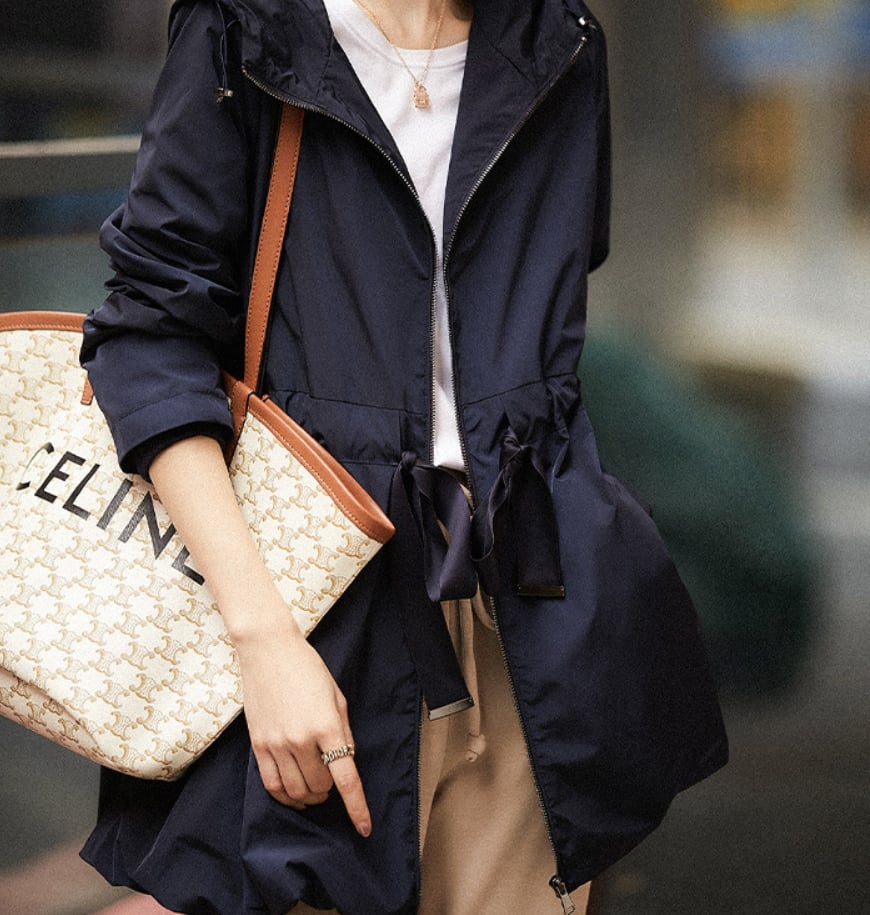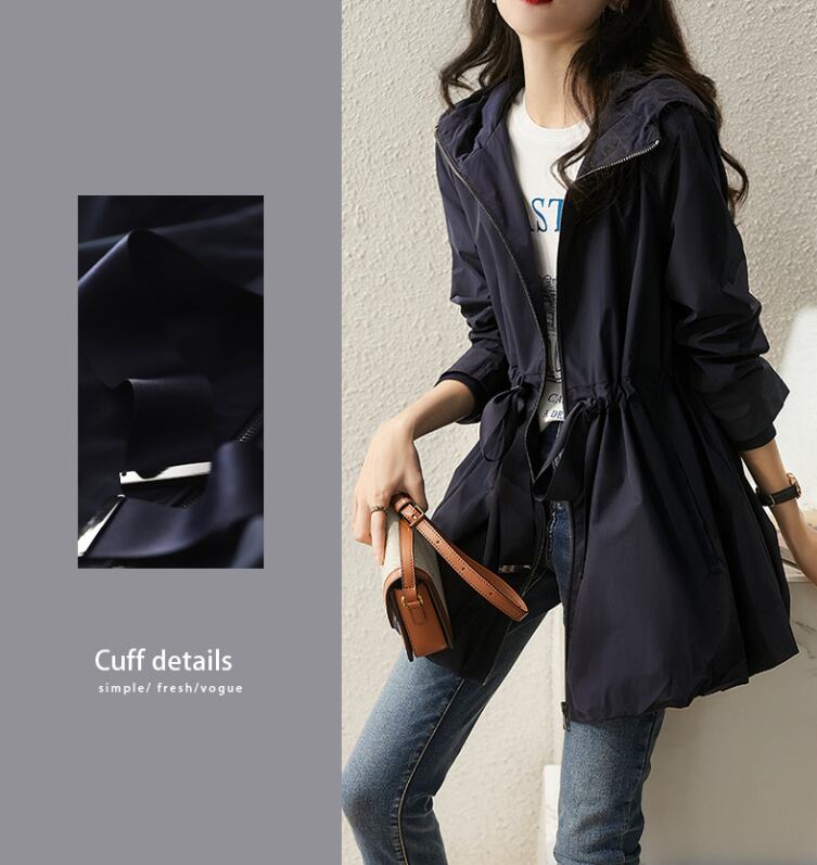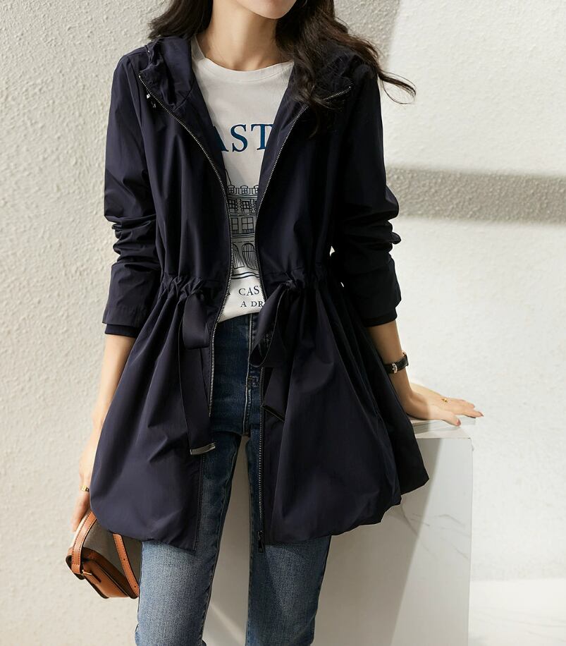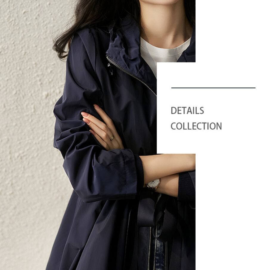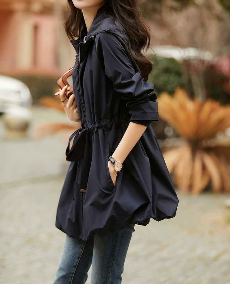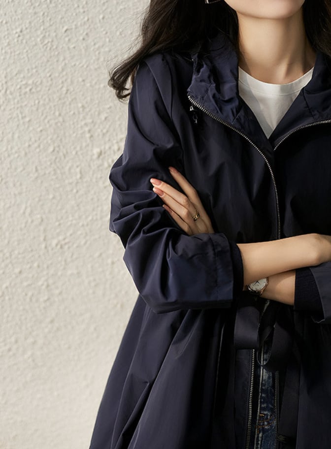 このウインドブレーカーは、ウエストを絞ることでスタイルアップ効果を実現♪フード付きのため、風が強い日にも安心してお出かけできます。Aラインのシルエットとミディアム丈が体型をカバーしつつ、こなれ感を演出。ファスナー仕様とポケット付きで、実用性も兼ね備えています。通勤や通学、デート、お出かけにと多彩なシーンで大活躍すること間違いなし!重ね着にも最適なアイテムです。また、ナイトブルーの落ち着いた色合いが、どんなスタイルにも合わせやすいです。