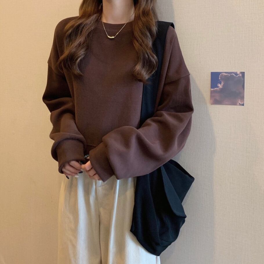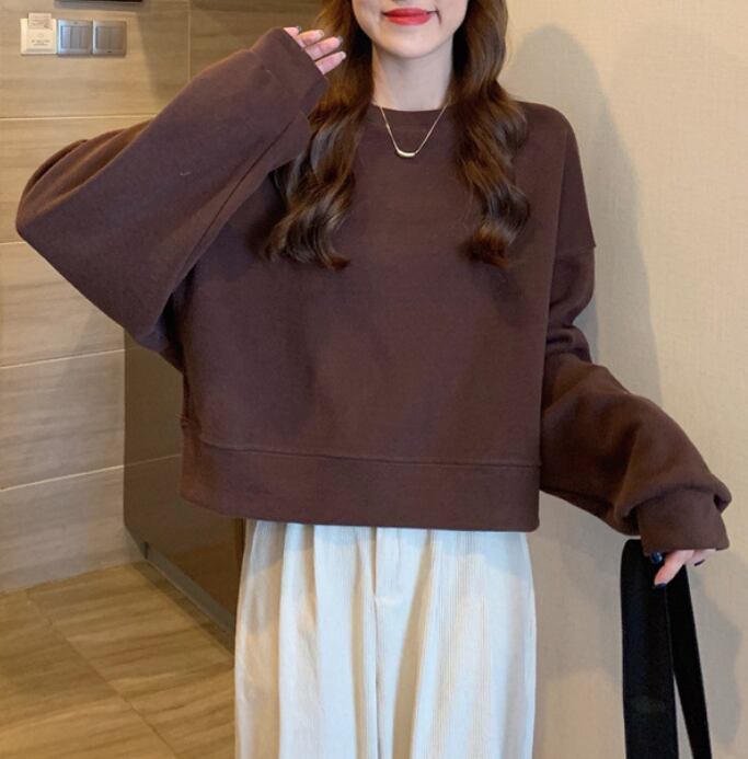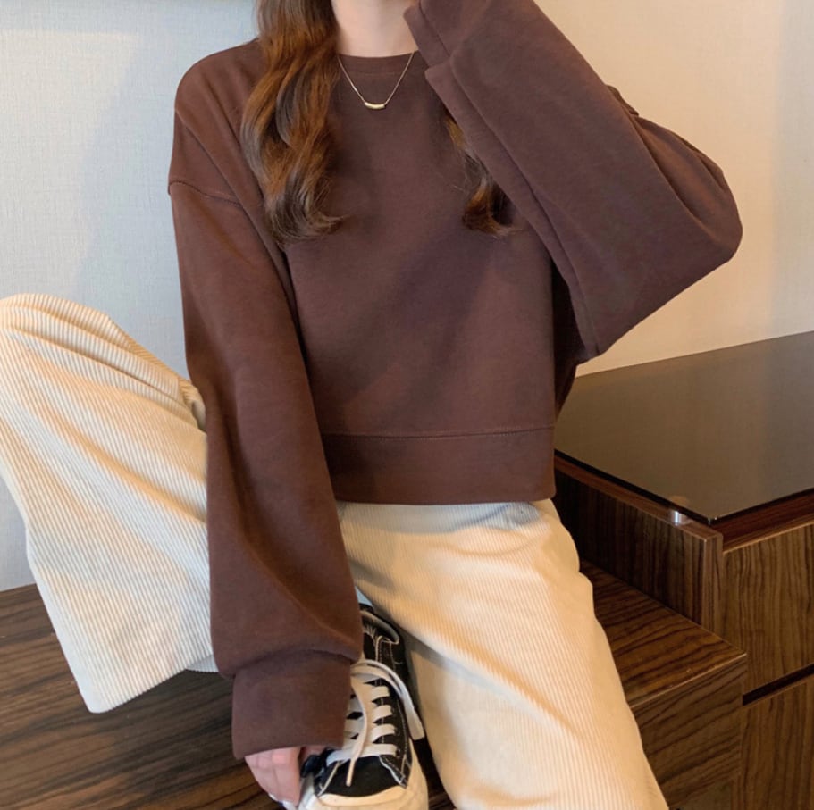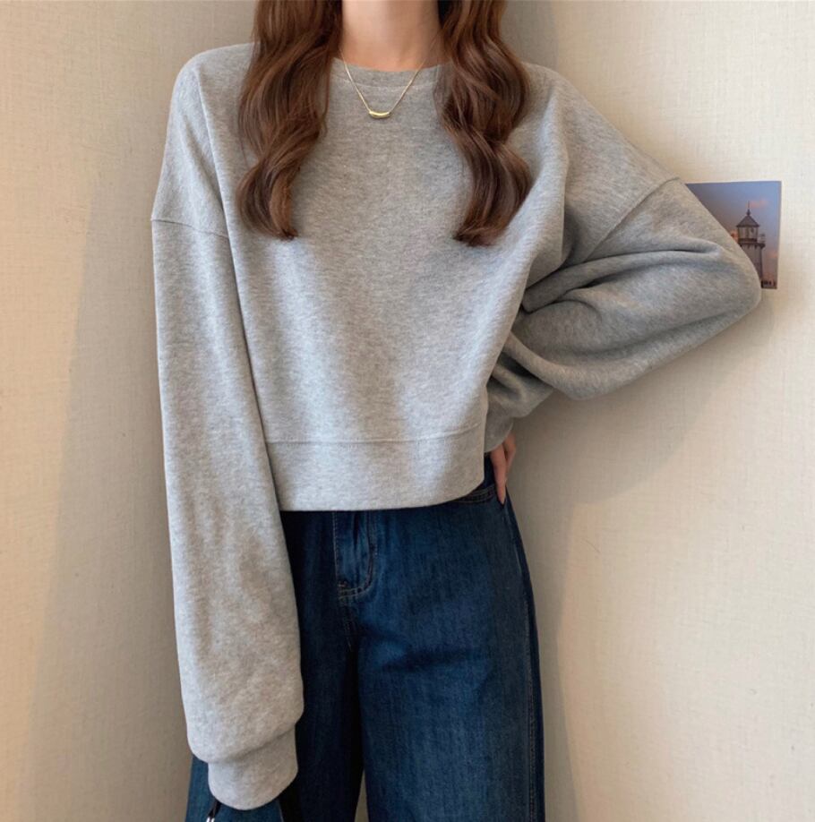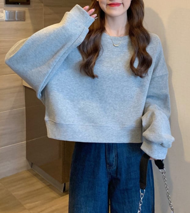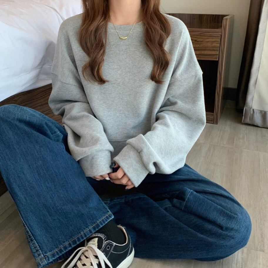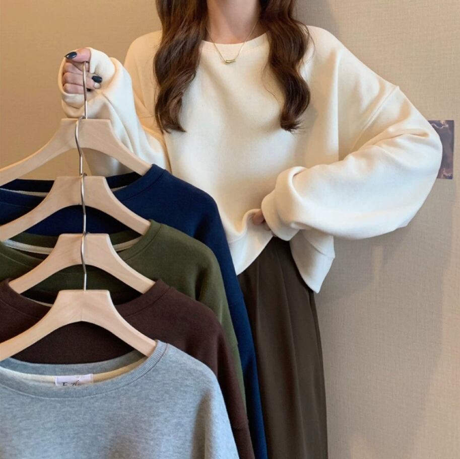 おしゃれでかわいい「ショート丈 ラウンドネック ルーズ トレーナー」のご案内です!春、秋、冬にぴったりなアイテムで、シンプルながらも大人可愛いデザインが魅力の一着です☆