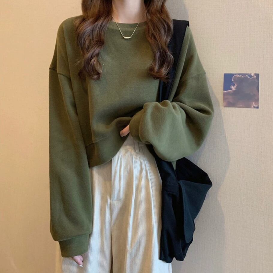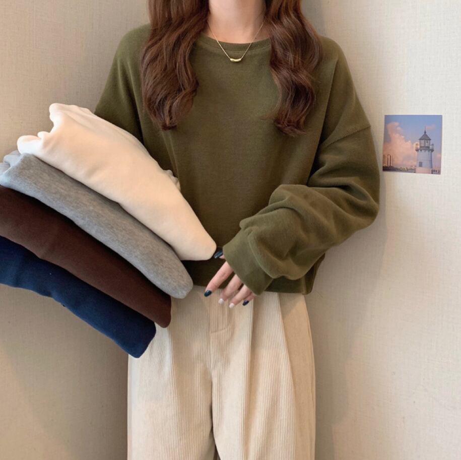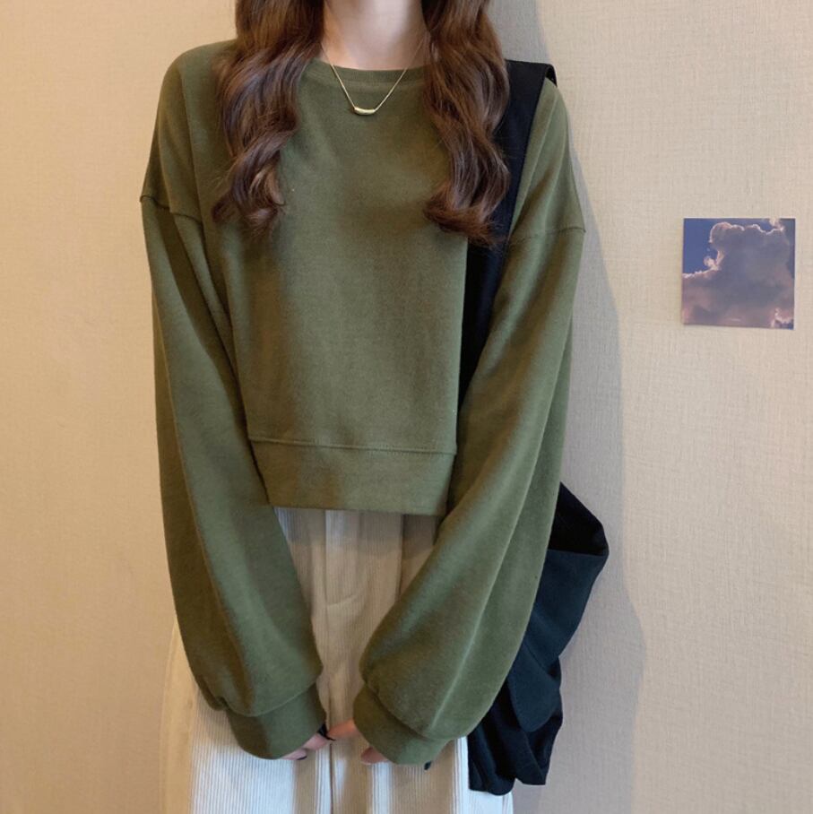ショート丈 ラウンドネック ルーズ トレーナー レディース トップス プルオーバー ショート 長袖 ドロップショルダー 萌袖 ラウンドネック 襟なし かわいい 大人可愛い きれいめ シンプル カジュアル おしゃれ こなれ感 ルーズ 無地 春 秋 冬 ママ 通勤 学生 学校 通学 デート お出かけ 旅行 公園 女子会 休日 ショッピング カフェ 重ね着 韓国 オルチャン 暖かい 体型カバー 普段使い 着回し レイヤード ゆったり フリーサイズ グレー ベージュ ブルー 緑 グリーン カレーブラウン