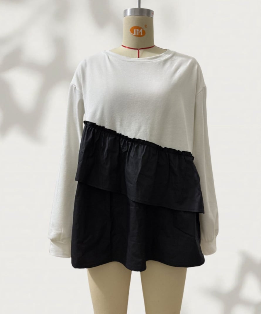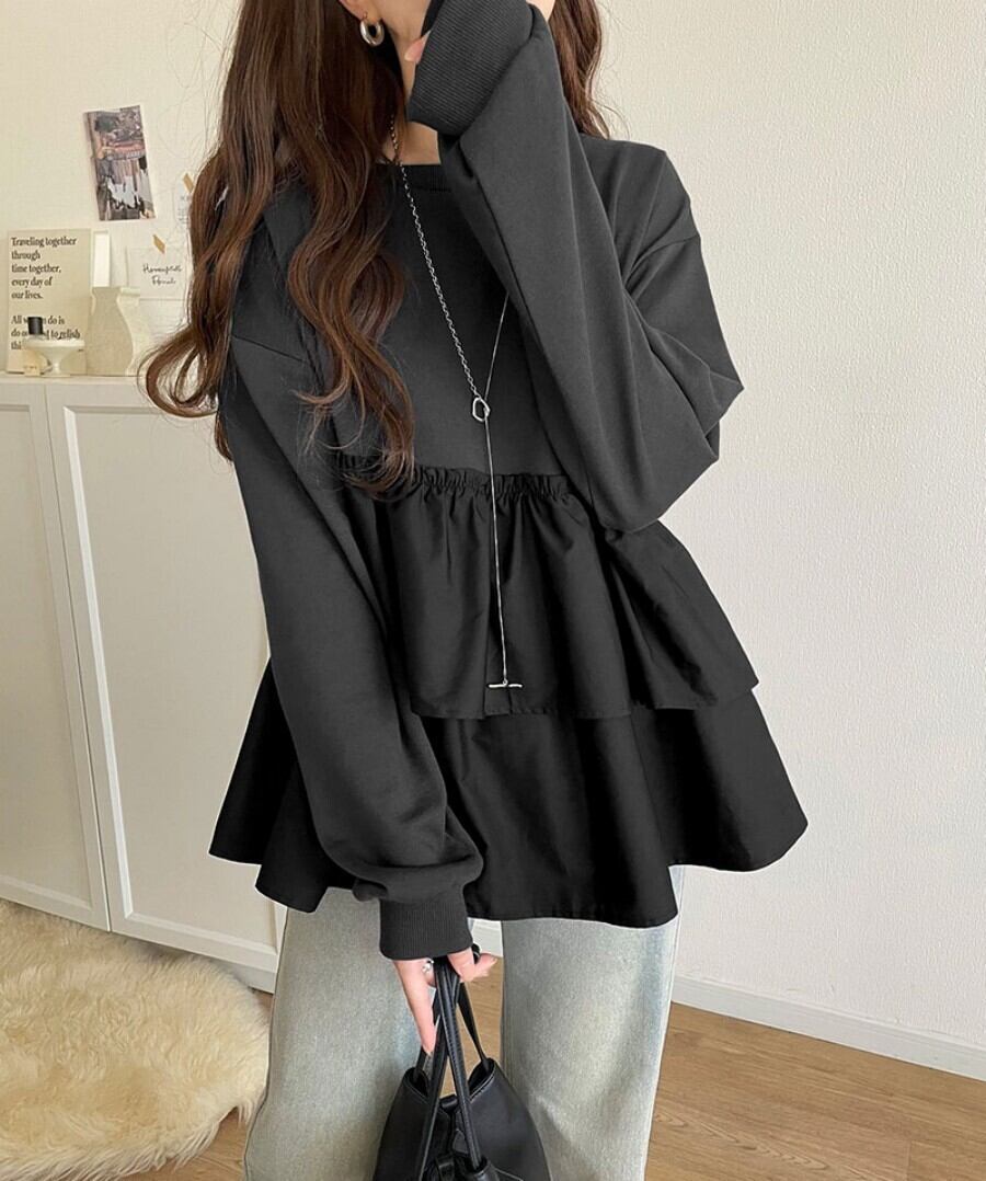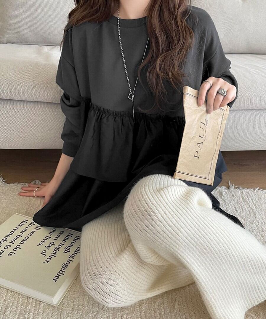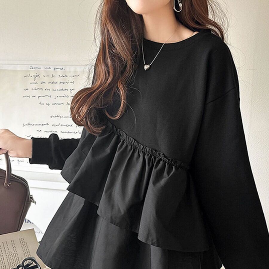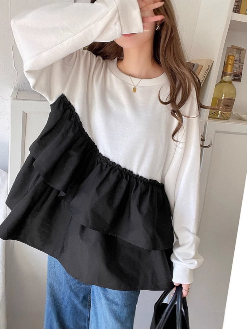 バイカラー アシメ ティアード ロンTは、個性的なデザインが魅力のフェミニンなトップスです!アシンメトリーな切り替えが特徴で、カットソー素材のプルオーバーはリラックス感たっぷり。丈長ミディアムカットで、ハイウエストとのコーディネートもバッチリ決まります☆シンプルでありながらおしゃれな印象を与え、普段使いから通勤、デート、お出かけまで幅広く活躍できるアイテムです!春、秋、冬の3シーズン使用可能で、体型カバー効果も抜群です。
