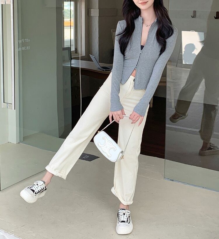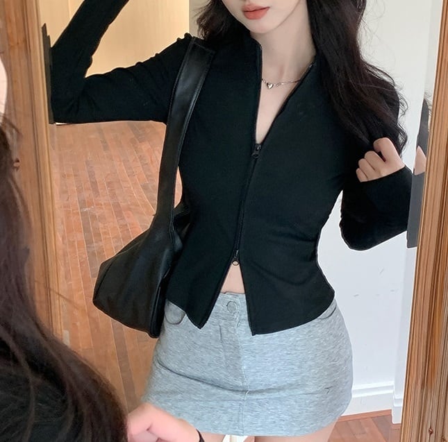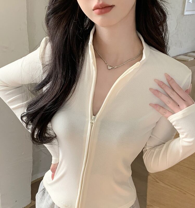 ショート丈 立ち襟 スリム ジップアップ リブ ジャケット トップス ニット インナー ショート 長袖 襟付き スタンドカラー 細身 ファスナー 前開き リブニット 薄手 かわいい 大人可愛い きれいめ シンプル カジュアル おしゃれ 無地 春 秋 冬 ママ 通勤 学生 学校 通学 デート お出かけ 旅行 公園 女子会 休日 重ね着 韓国 オルチャン 体型カバー 普段使い 着回し レイヤード S M L XL 2XL 大きいサイズ 黒 ブラック ライトグレー ダークグレー オフホワイト コーヒーブラウン