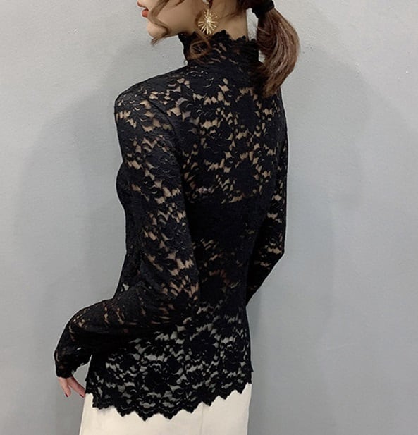 透かし編みとレースを使用した華やかなデザインが特徴のこのトップスは、シースルーの透け感が上品さを引き立て、フェミニンでありながらもシンプルな美しさを演出しています。襟付きのスタンドカラーが大人可愛い印象を与え、重ね着としても活躍します。通勤や通学、デート、お出かけ、旅行まで幅広くお使いいただける一着です!