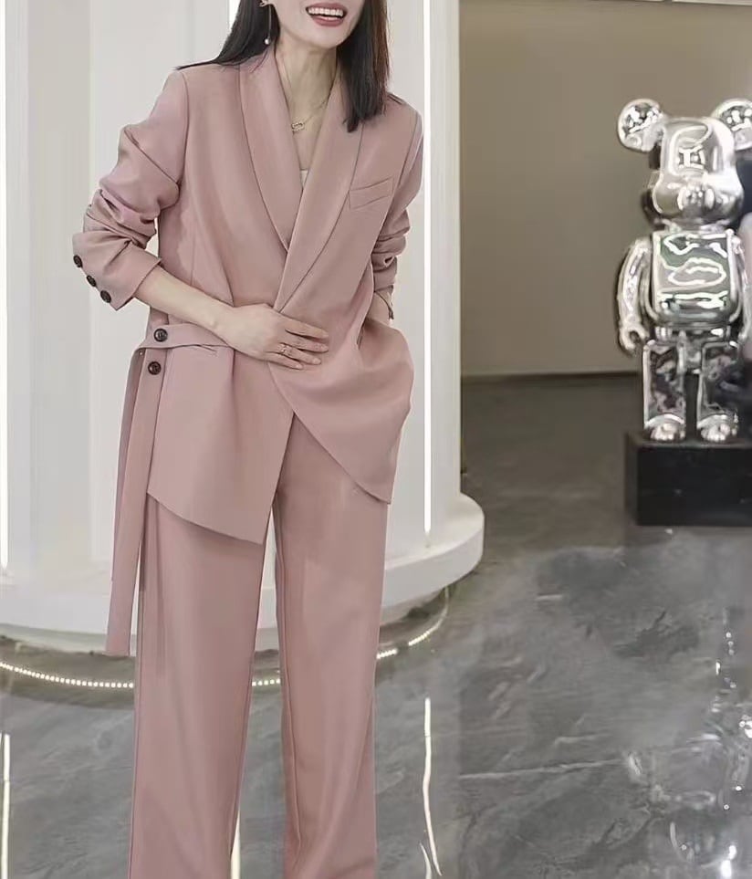 腰ひも付きのジャケットは、しっかりとしたシルエットを生み出しつつ、楽な着心地を実現。ロングパンツはワイドパンツデザインで、体型カバーにも最適です。シンプルなVネックの前開きデザインが上品さを引き立て、大人のおしゃれを演出します!通勤や授業参観、デート、お出かけ、女子会など、幅広いシーンで主役の一着となること間違いなしです☆