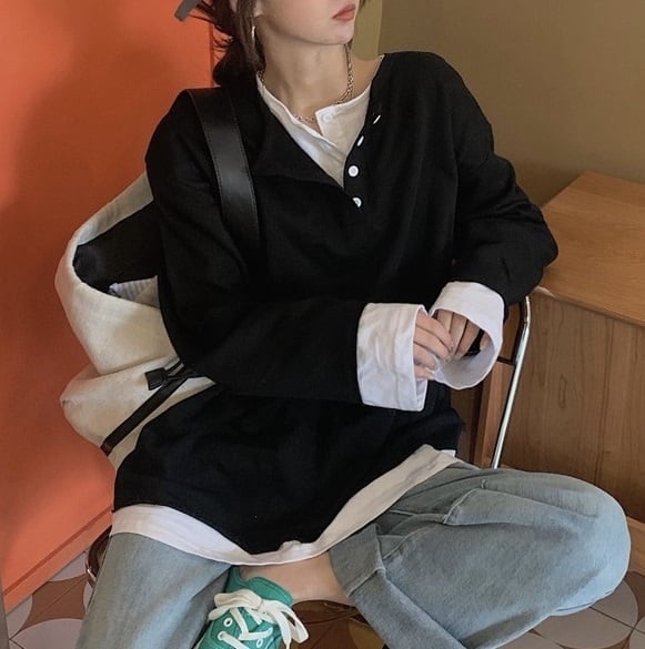 大人可愛い「重ね着風 ヘンリーネック ルーズ 長袖 ロンT」のご紹介です!こちらのロンTは、春・秋・冬のさまざまなシーンで活躍する、シンプルでおしゃれなアイテムです☆