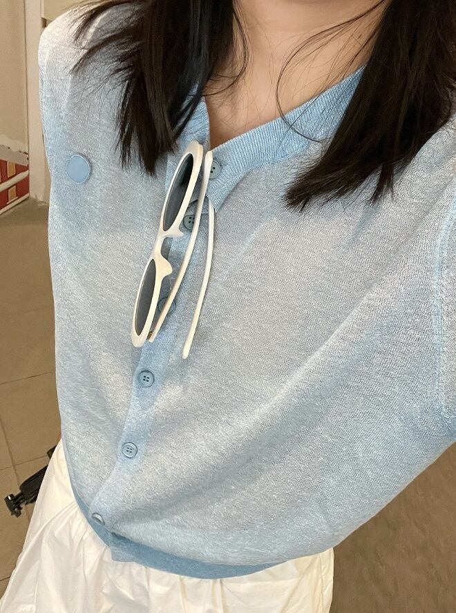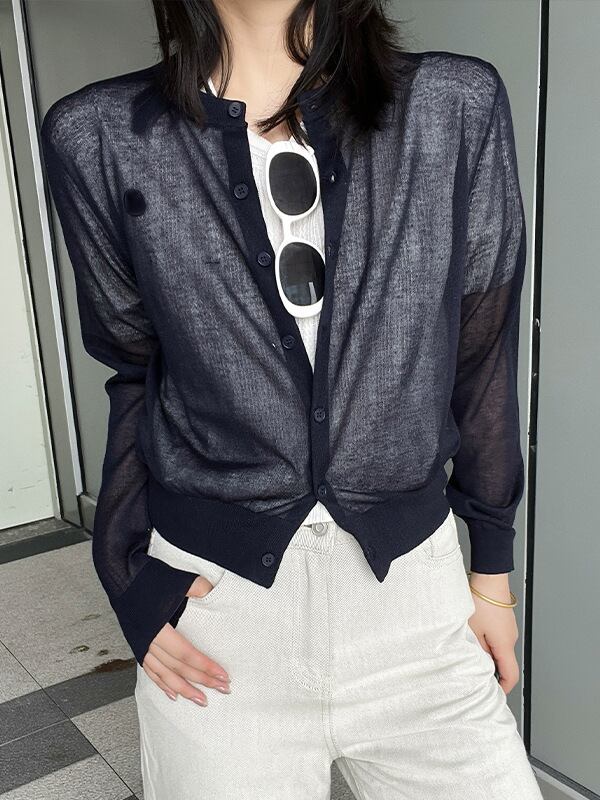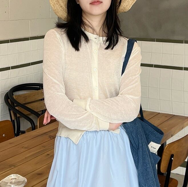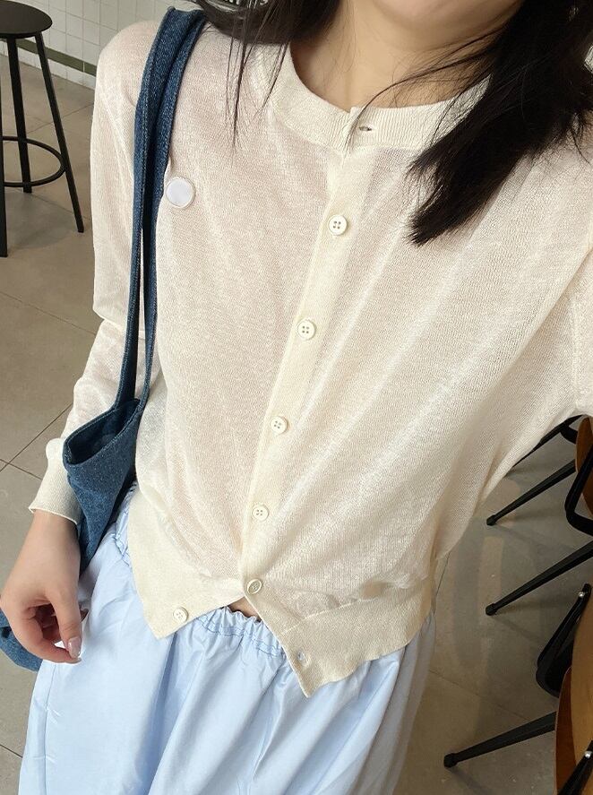 薄手 リネン ラウンドネック シアー ニットカーディガン レディース トップス ニット カーディガン 羽織 ショート 長袖 襟なし スリム 細身 前開き 透け感 シースルー ボタン かわいい 大人可愛い きれいめ シンプル カジュアル おしゃれ こなれ感 無地 春 夏 秋 ママ 通勤 学生 学校 通学 デート お出かけ 旅行 公園 女子会 休日 ショッピング お花見 カフェ 重ね着 体型カバー 普段使い 着回し レイヤード 紫外線対策 UV対策 S M L 水色 ネイビー ライトブルー ミルクホワイト