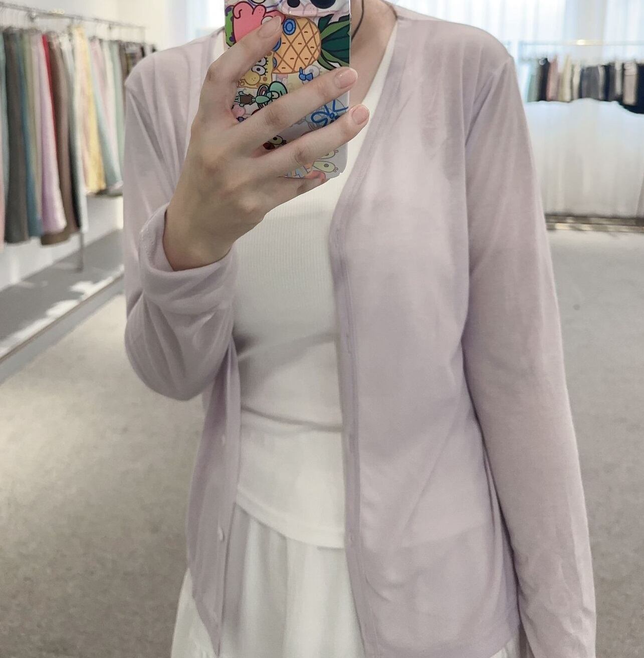 春カラーの大人可愛い「Vネック 長袖 テンセル ニットカーディガン」のご紹介です!こちらのカーディガンは、春・夏・秋のさまざまなシーンで活躍する、上品でおしゃれなアイテムです☆