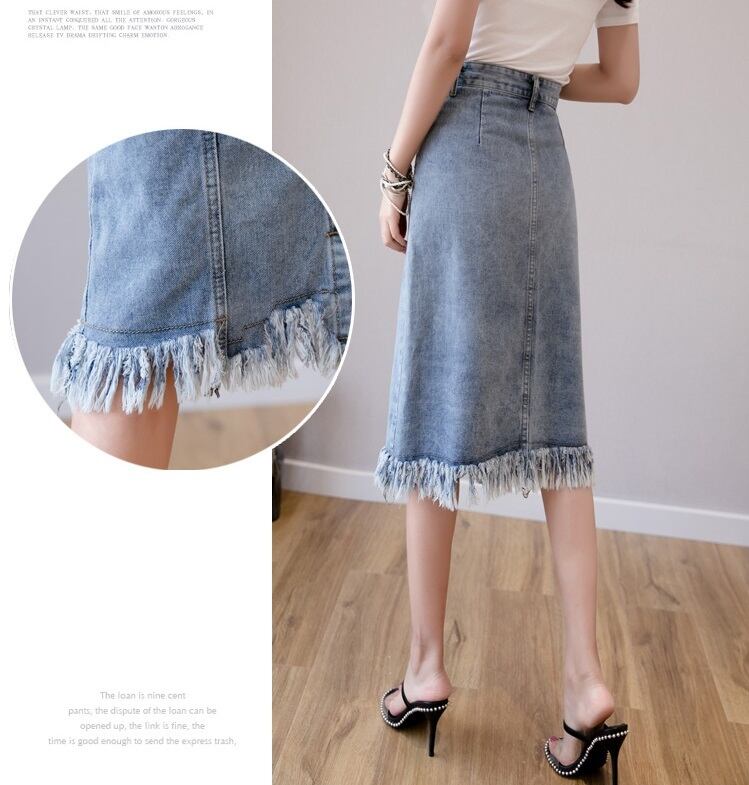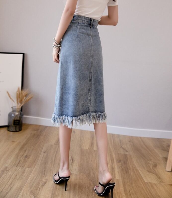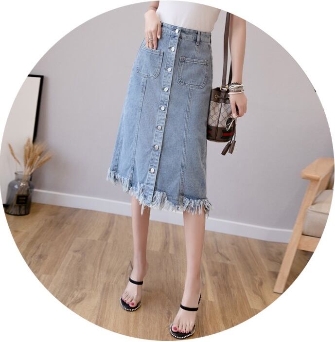 ボトムス デニム スカート 膝丈 ひざ丈 ミディ丈 ハイウエスト フロントボタン ポケット付き 切りっぱなし ダメージ加工 フリンジ デザイン Aライン カジュアル かわいい 可愛い 通勤 通学 学生 女の子 大人女子 普段着 普段使い 着回し お出かけ デート 旅行 女子会 休日 10代 20代 春 夏 秋 S M L X 3211