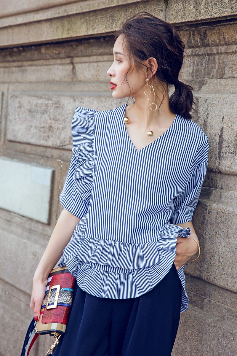 トップス フリル ストライプ ブラウス カジュアル 韓国系ファッション オフィス ビジネス OL 通勤 お洒落 ルームウェアー お散歩コーデ スポーティー 学生 通学 お揃い 双子コーデ 上下セット 着回し 普段使い 柔らか素材 モテ 10代 20代 デート 夏 703