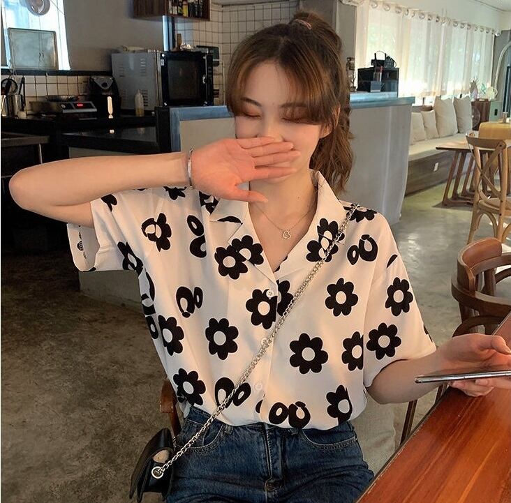 トップス 半袖 シャツ 花柄 フラワー ポロ襟 襟付き フロントボタン 開襟 ゆったり ルーズ バイカラー おしゃれ お洒落 かわいい 可愛い カジュアル レディース 通勤 通学 学生 女の子 お出かけ 旅行 休日 普段使い 普段着 着回し 10代 20代 夏 S M L XL ブラック 黒 3216