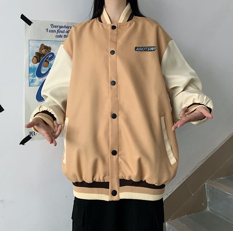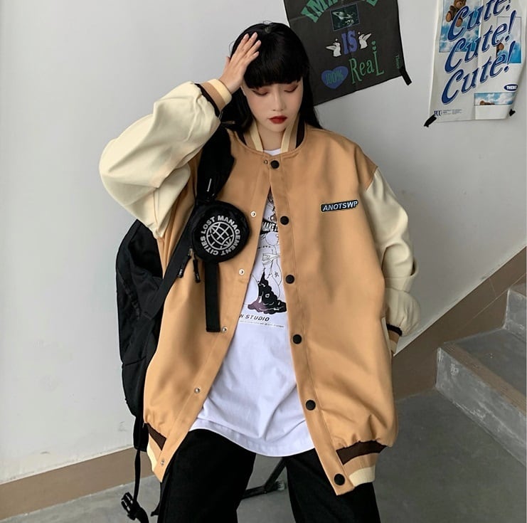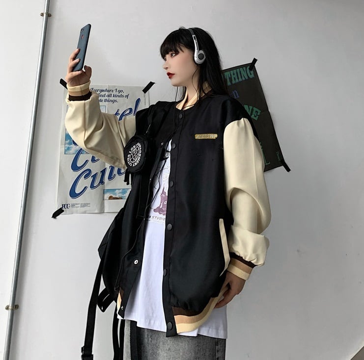 アウター ジャケット ブルゾン カラー 配色 ゆったり ルーズ ゆるだぼ 大きめ BF風 襟付き 刺繍 文字 長袖 袖あり ロゴ入り フロントボタン ポケット付き スポーティー スポーツ メンズライク ボーイッシュ ストリート カジュアル かっこいい クール おしゃれ お洒落 通勤 通学 学生 お出かけ デート 旅行 休日 普段着 普段使い 着回し 10代 20代 春 秋 冬 レディース 大きいサイズ M L XL 2XL ブラッ 4574