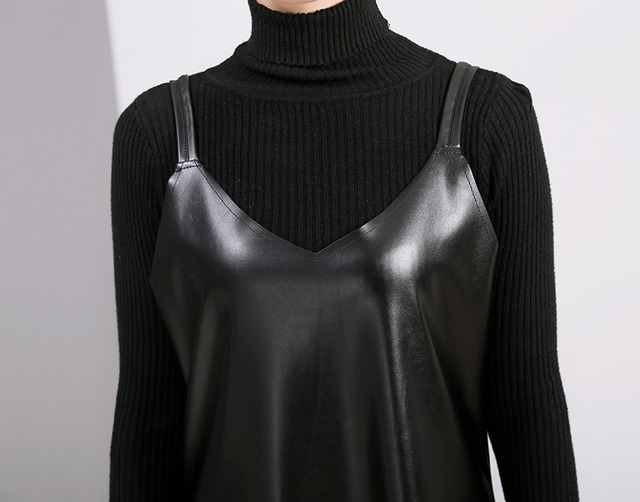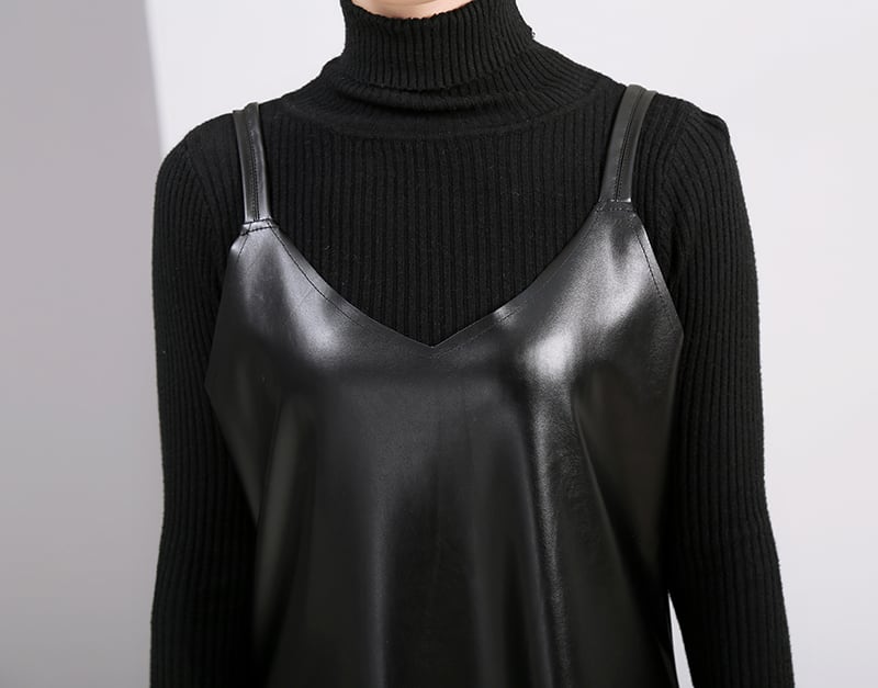 フェイクレザーキャミワンピース ワンピース 膝下 ロング丈 袖あり Vネック Iライン PU シンプル カジュアル 大人 おしゃれ お洒落 大人女子 こなれ感 無地 春 夏 秋 冬 オールシーズン 10代 20代 30代 40代 レディース デート お出かけ 公園デビュー 女子会 休日 着回し 普段使い 重ね着 韓国 韓国系 オルチャン ファッション ゆったり ゆる 4605
