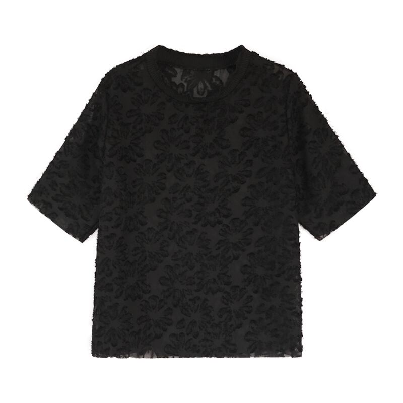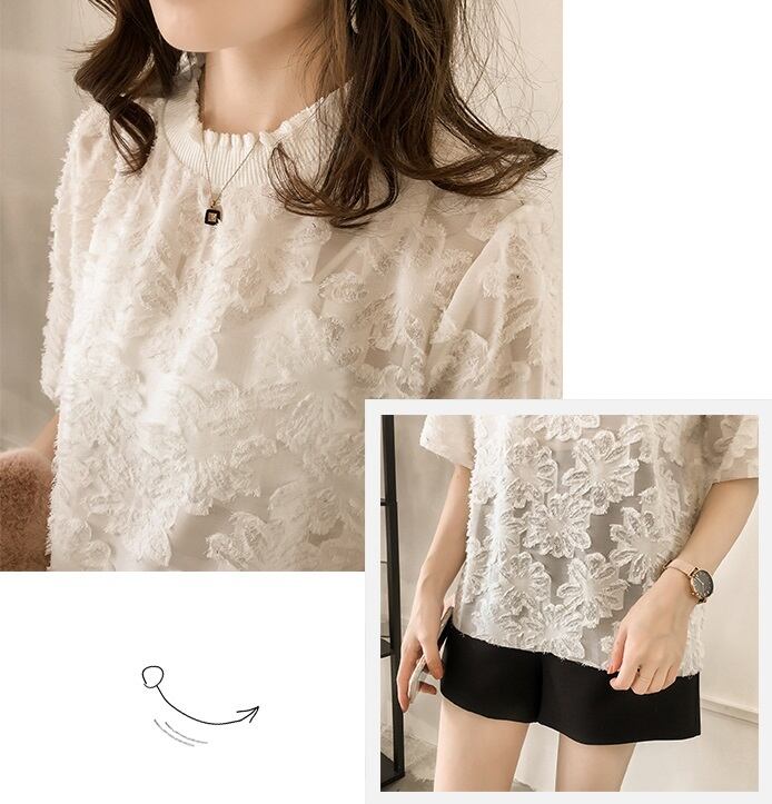 シフォン シャツ ブラウス 総花柄 花柄 レース ラウンドネック 半袖 袖あり 5分袖 五分袖 トップス シースルー 透け感 シアー 綿 コットン ゆったり ゆる 大きめ おしゃれ 主役級 お洒落 通勤 通学 学生 大人女子 お出かけ デート 旅行 休日 普段使い 普段着 着回し 10代 20代 レディース 夏 大きいサイズ M L XL 2XL 3XL ホワイト 白 967