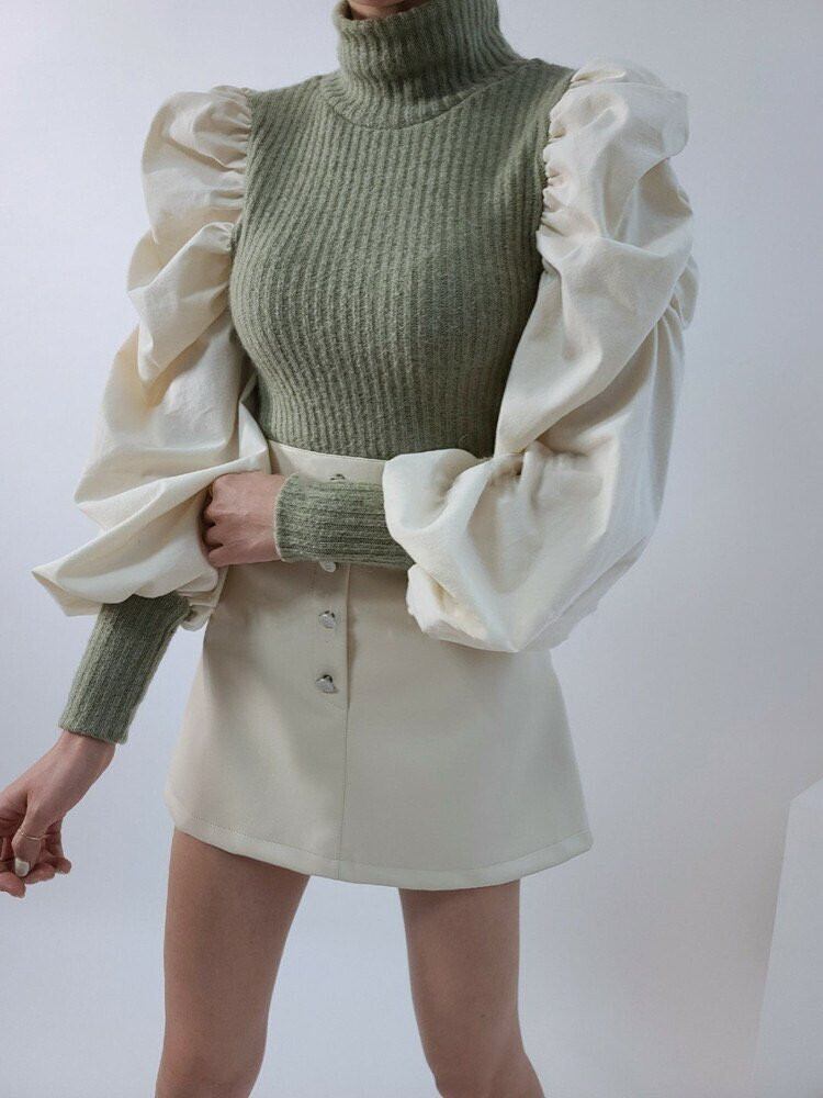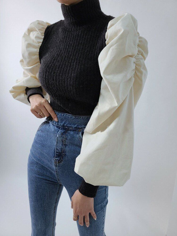 パワーショルダードッキングニット トップス セーター 袖あり 長袖 パフスリーブ ハイネック ドッキング ドッキング ウール かわいい 大人可愛い シンプル カジュアル おしゃれ お洒落 大人可愛い 大人女子 こなれ感 個性的 無地 秋 冬 10代 20代 30代 レディース 学生 通学 デート お出かけ 女子会 休日 着回し 普段使い 重ね着 韓国 韓国系 オルチャン 色展開 黒 ブラック 3696