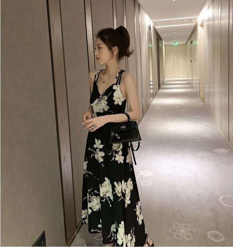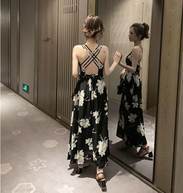 サマーワンピ 花柄 キャミワンピ ロング ワンピース シフォン キャミソールワンピース マキシ丈 Vネック クロスストラップ バッククロス 背中魅せ バックシャン 背中開き ハイウエスト 切り替え Aライン 袖なし ラフ 楽ちん ゆったり おしゃれ お洒落 大人 大人女子 大人可愛い かわいい 可愛い 海 ビーチ リゾート プール 旅行 休日 10代 20代 レディース 夏 S M L XL ブラック 黒 1006