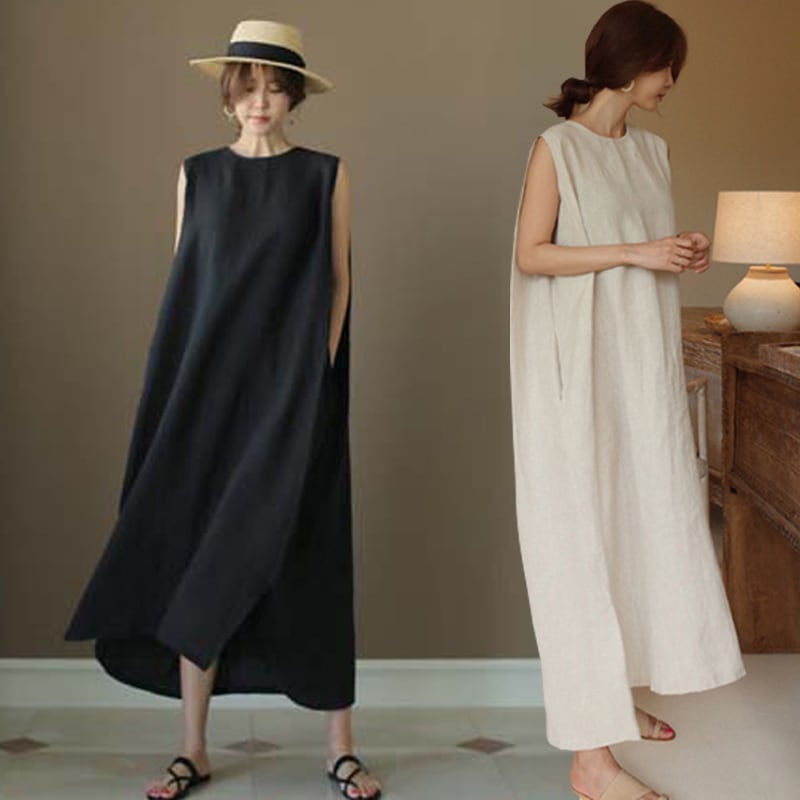 カジュアルワンピース ロング丈 ノースリーブ ラウンドネック リネン シンプル 春 夏 10代 20代 30代 40代 50代 レディース お出かけ 休日 普段使い 楽ちん 体系カバー S M L XL ブラック アプリ 5012