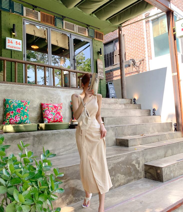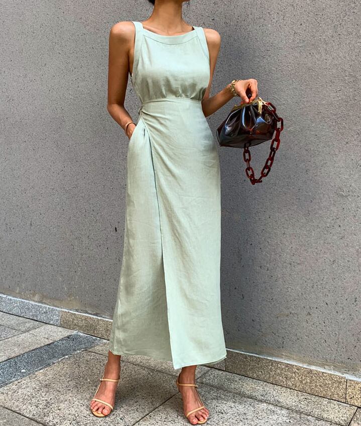 スリットラップワンピース ワンピース ロング ロング丈 マキシ マキシ丈 袖なし ノースリーブ ラウンドネック スリム タイト 細身 Iライン リボン ウエストマーク ウエストリボン 綿 麻 リネン かわいい 大人可愛い きれいめ シンプル カジュアル 大人 おしゃれ お洒落 大人可愛い 大人女子 エレガント 無地 春 夏 10代 20代 30代 レディース デート お出かけ 女子会 休日 着回し 普段使い 韓国 韓国系 オルチャン 色展開 5249