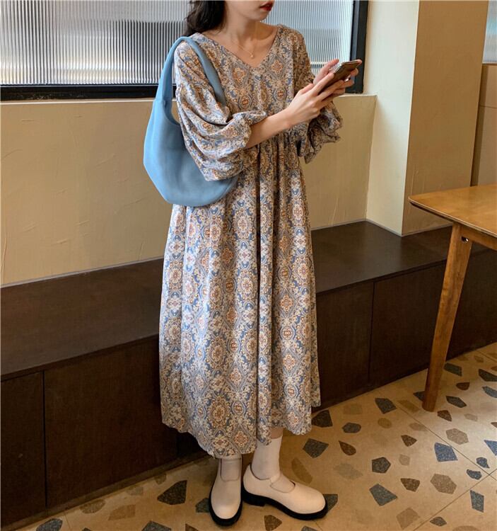 レトロエスニックワンピース ワンピース フレアワンピース ロング ロング丈 ミディアム丈 袖あり 7分袖 七分袖 ボリューム袖 Vネック フレア Aライン かわいい 大人可愛い シンプル カジュアル 大人 おしゃれ お洒落 レトロ エスニック 大人可愛い 大人女子 個性的 柄 春 夏 秋 10代 20代 30代 レディース デート お出かけ 女子会 休日 着回し 普段使い 韓国 韓国系 オルチャン 色展開 黒 ブラッ 5256