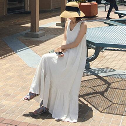 バッグリボン付きノースリーブワンピース ワンピース フレアワンピース ロング ロング丈 マキシ マキシ丈 袖なし ノースリーブ Vネック フレア リボン 切り替えデザイン 綿 麻 リネン かわいい 大人可愛い シンプル カジュアル 大人 おしゃれ お洒落 大人可愛い 大人女子 こなれ感 ラブリー キュート ガーリー 無地 春 夏 10代 20代 30代 レディース デート お出かけ 女子会 休日 着回し 普段使い 韓国 韓国系 オルチャン サイズ S M L XL 色展開 5260