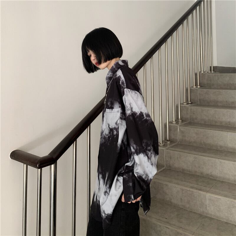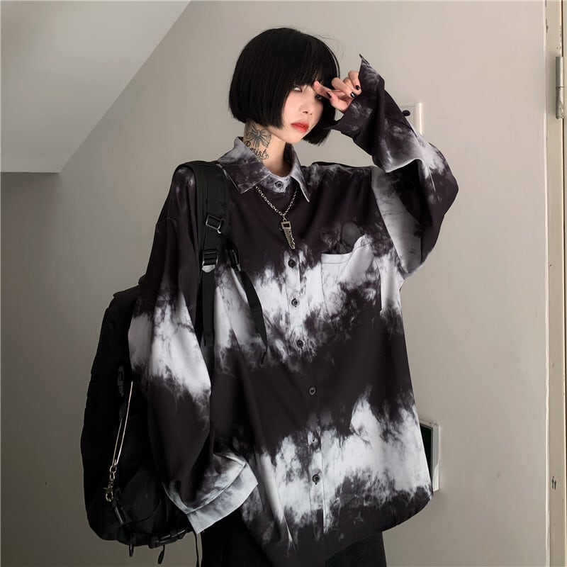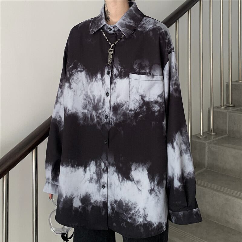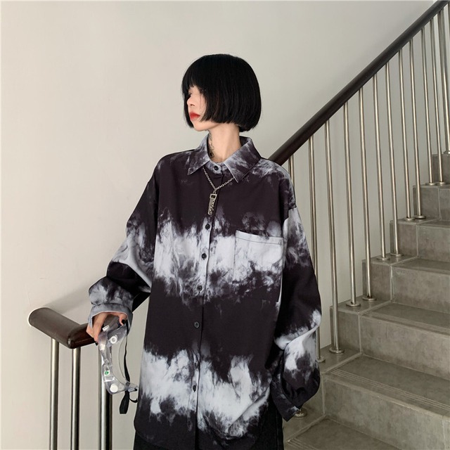 トップス オーバーサイズ シャツ 長袖 袖あり 染色 カラー タイダイ 絞り染め プリント 襟付き ポロ襟 ポケット付き フロントボタン 前開き ゆったり ゆるだぼ 大きめ シック クール かっこいい ストレート メンズライク ボーイッシュ おしゃれ お洒落 通勤 通学 学生 お出かけ デート 旅行 休日 普段着 普段使い 着回し ワンサイズ 4185