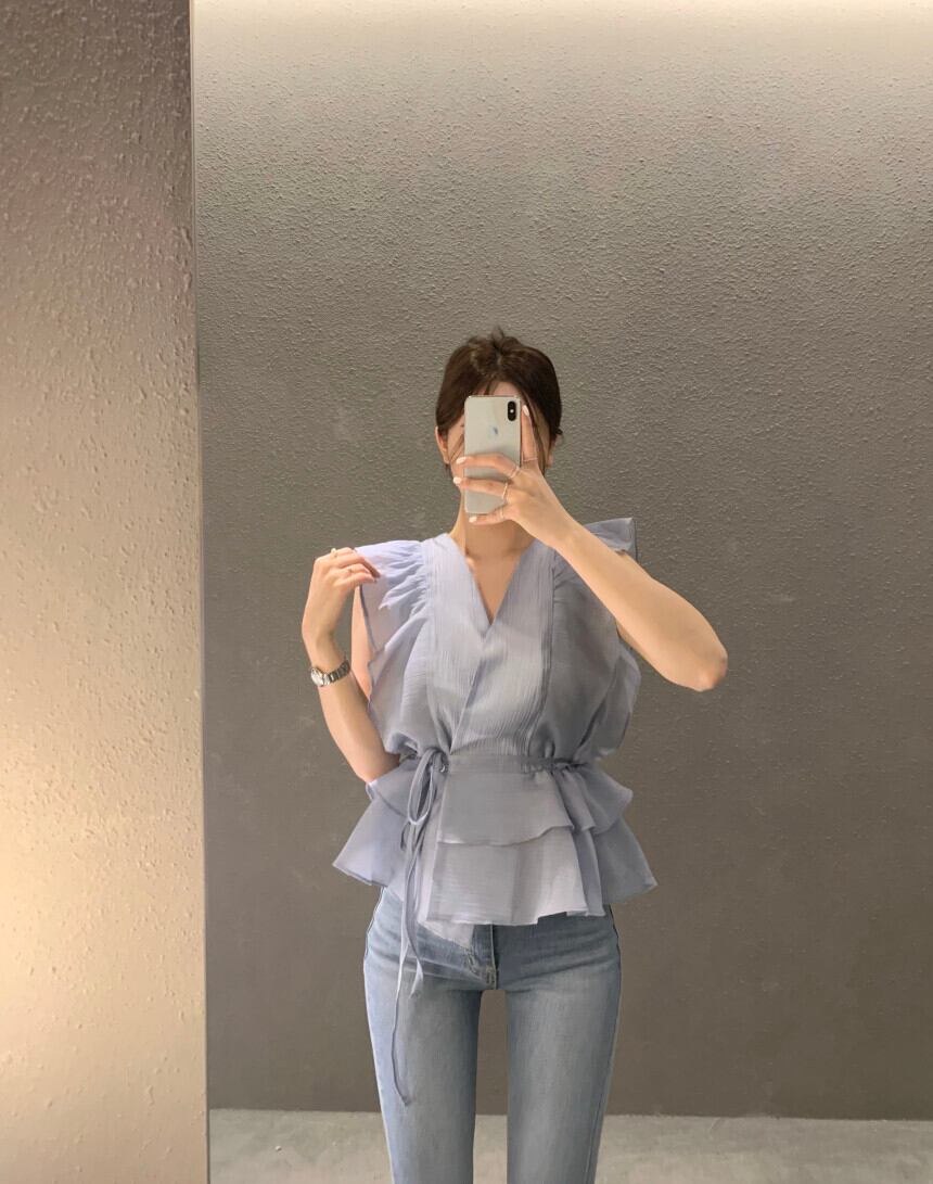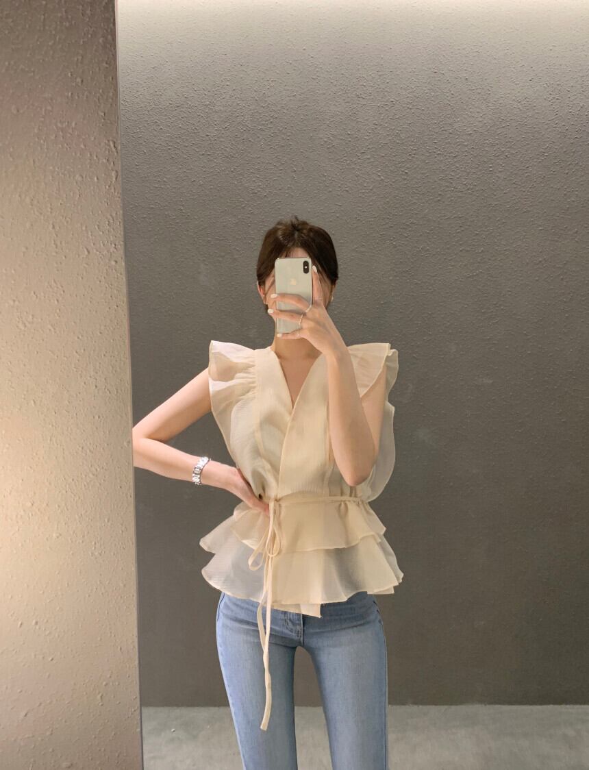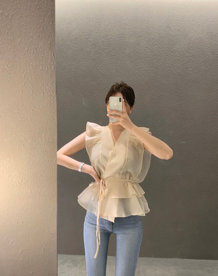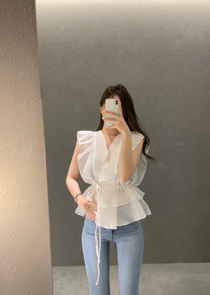 トップス 4色展開 袖なし ノースリーブ フレンチスリーブ Vネック カシュクール 切り替えデザイン シフォン フリル ウエストマーク ウエストリボン かわいい 大人可愛い きれいめ シンプル カジュアル 大人 上品 おしゃれ お洒落 無地 春 夏 20代 30代 レディース マタニティ デート お出かけ お泊まり 休日 S M L ホワイト ブラック ブルー 5052