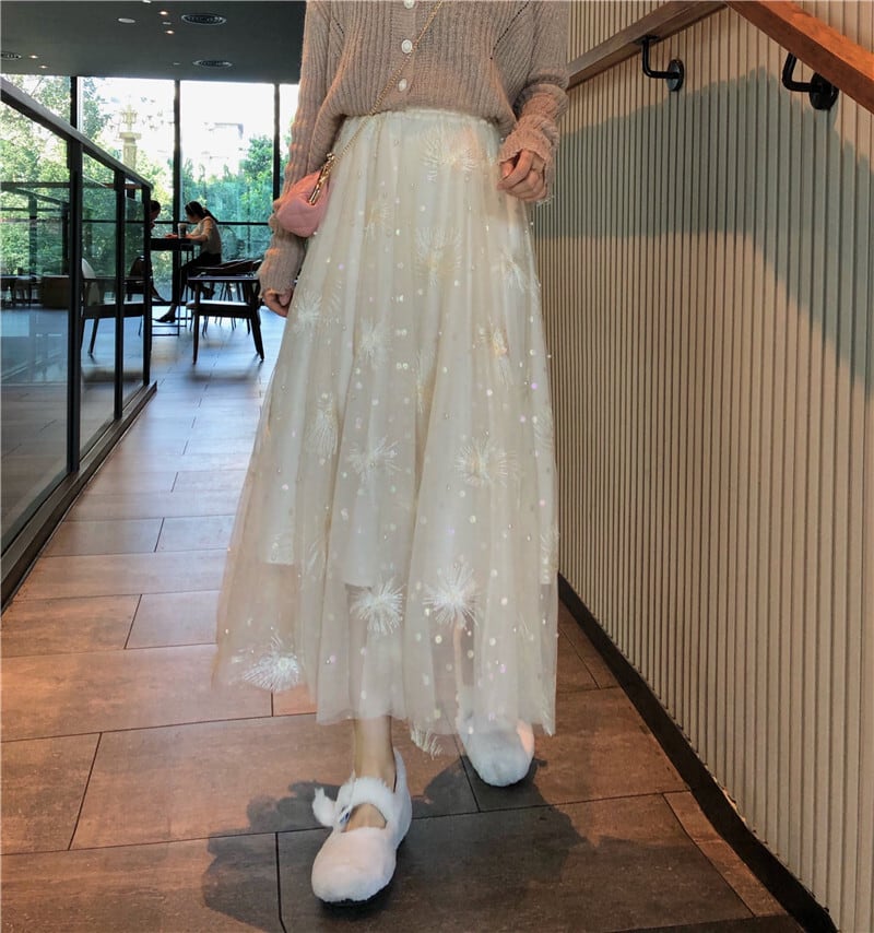 スカート 2色展開 ボトムス ロングスカート フレアスカート チュールスカート 膝下 ロング ロング丈 ミドル丈 フレア Aライン チュール ふわふわ ウエストゴム かわいい 大人可愛い きれいめ 上品 おしゃれ お洒落 春 夏 秋 冬 10代 20代 30代 デート お出かけ 女子会 お泊まり 休日 着回し 普段使い 韓国 オルチャン フリーサイズ ワンサイズ ホワイト 1493